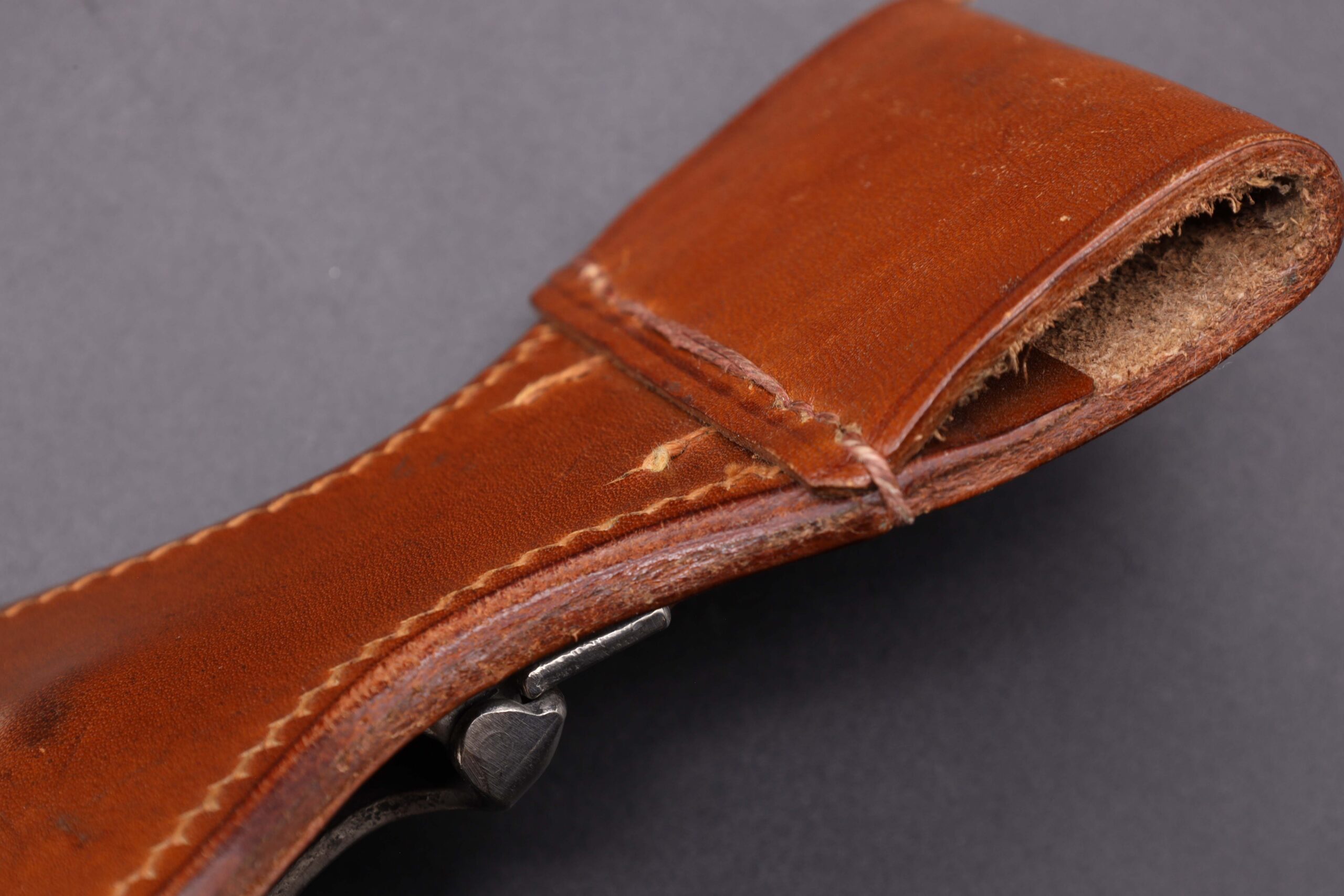 German WW2 Army officers dagger belt loop made to be clipped on a Army dagger hanger. Brown leather construction with nickel plated steel clip. Great overall condition.