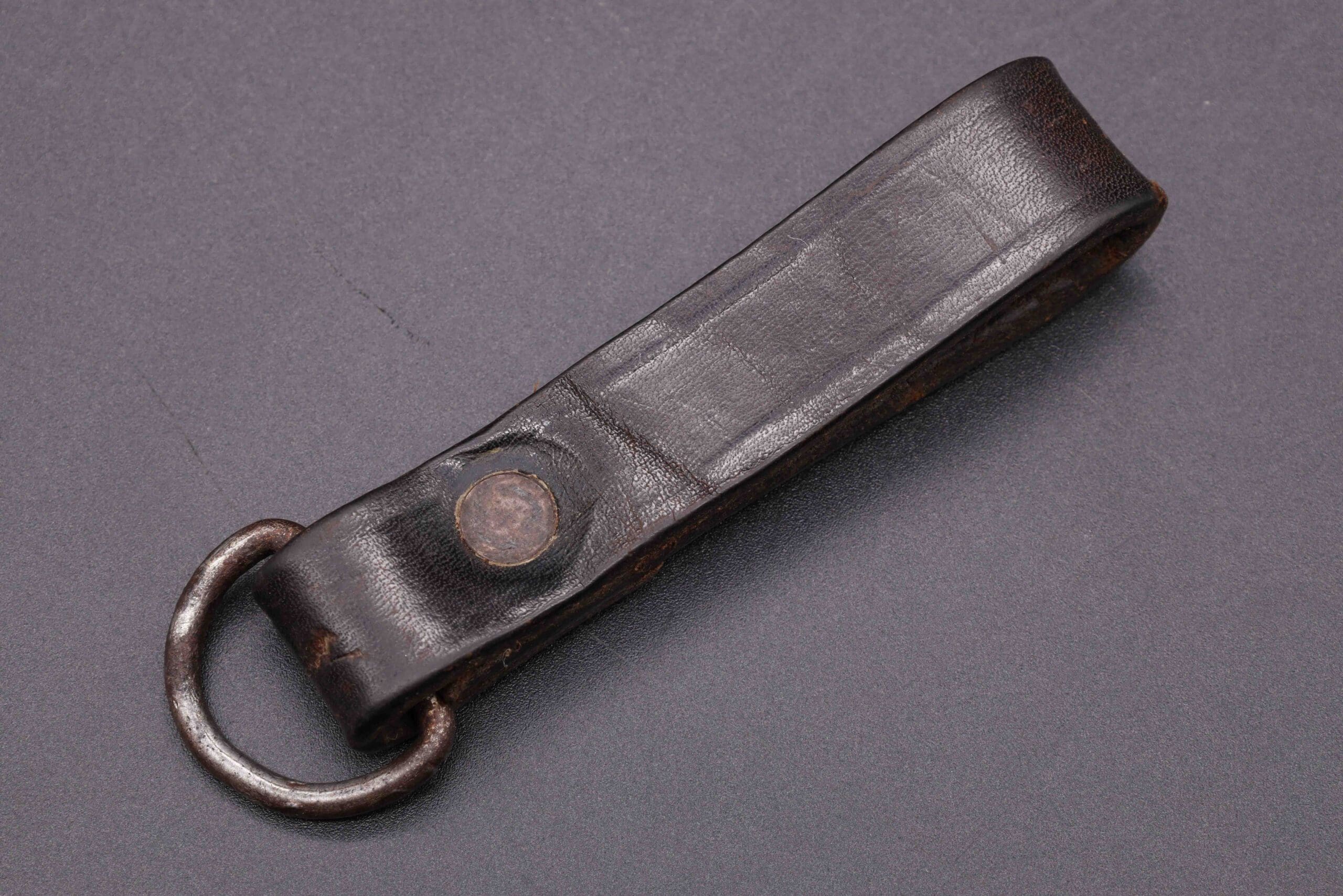 Black leather belt loop for SS/NSKK daggers. Unmarked. Good condition. Steel magnetic ring. Stiff healthy leather.