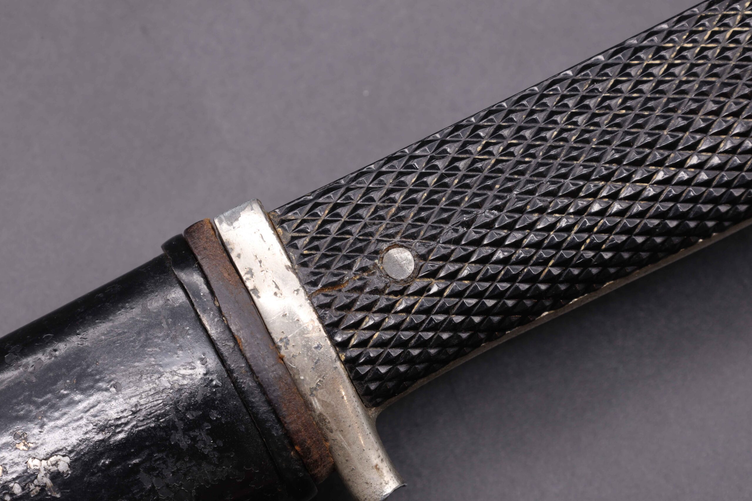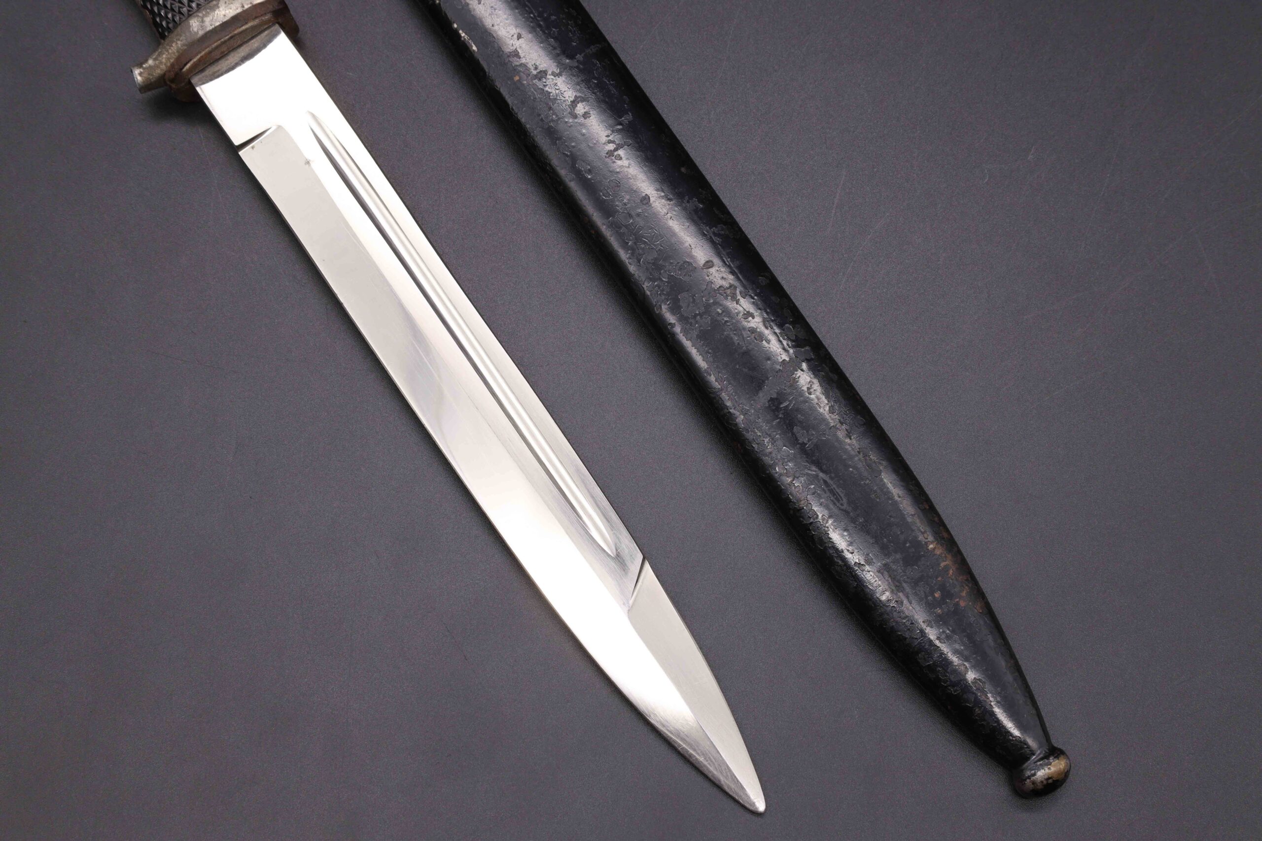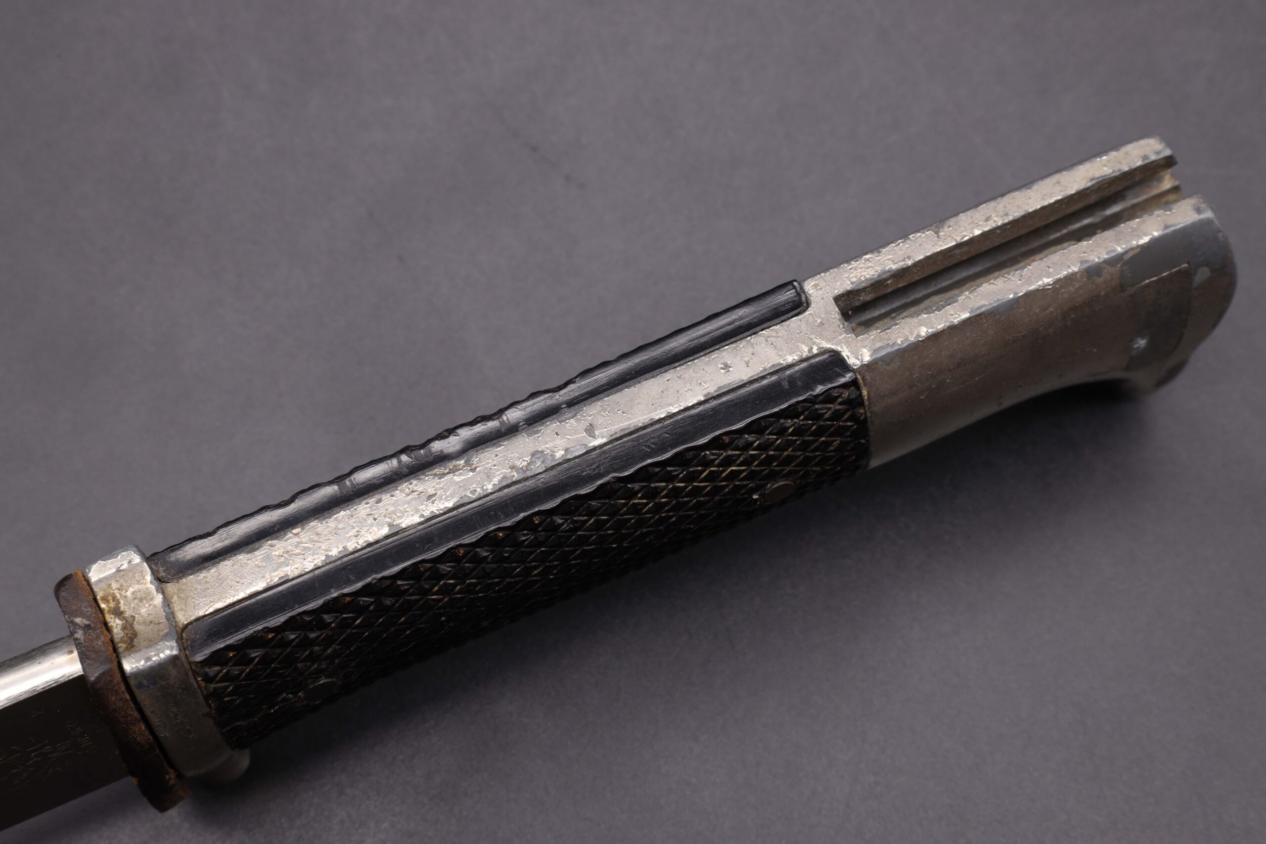Worn condition German WW2 dress bayonet made by Eickhorn. Note the hilt hook is broken off and the bayonet is the short model but the scabbard is for the long model. Nickel plated zinc hilt. Black bakelite grip plates held on by two steel rivets. The grip plate on the backside has two cracks. Clean short model nickel plated steel blade, stamped on the backside with the Carl Eickhorn makers mark. Leather buffer pad in place. Repainted black steel scabbard, long model.
