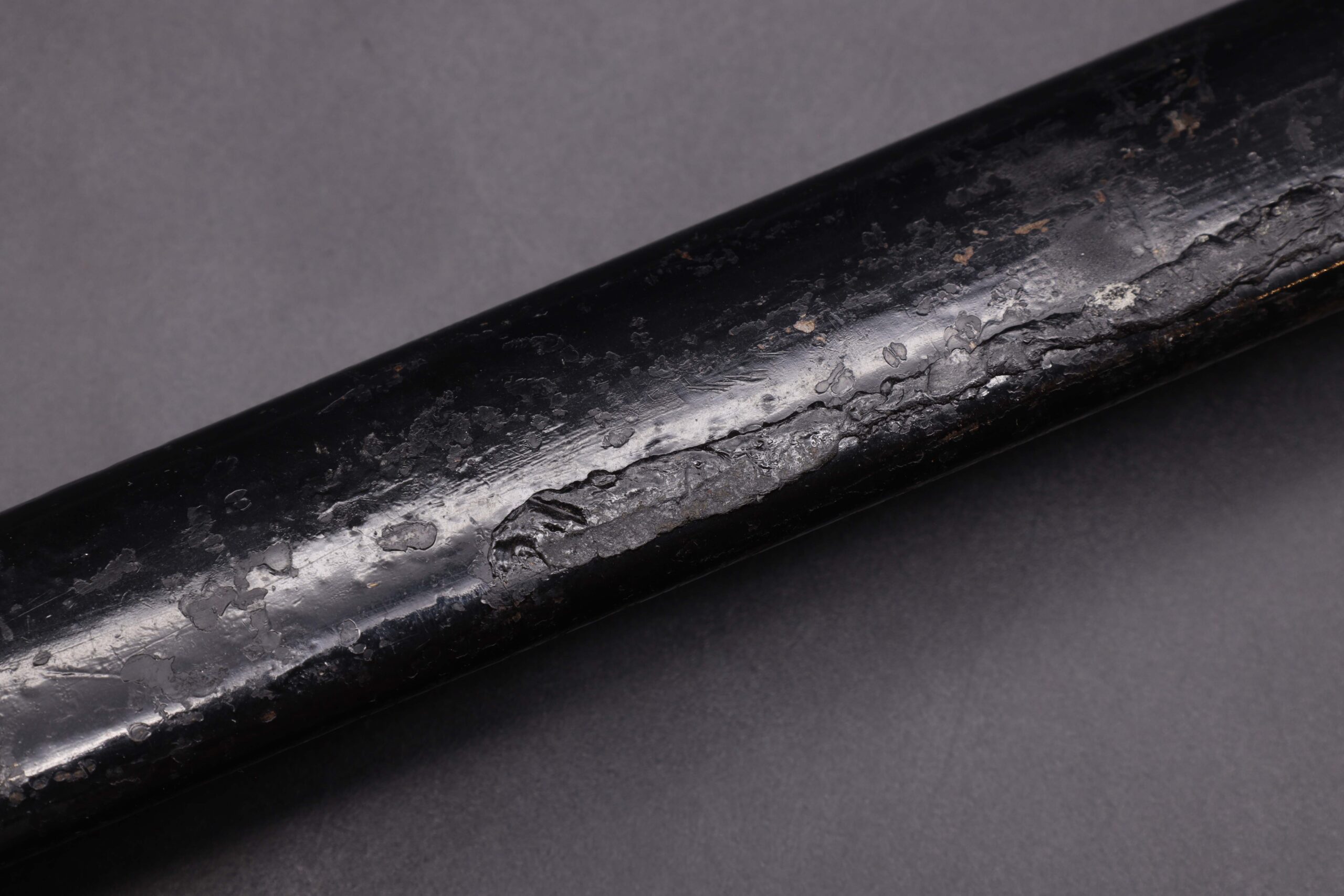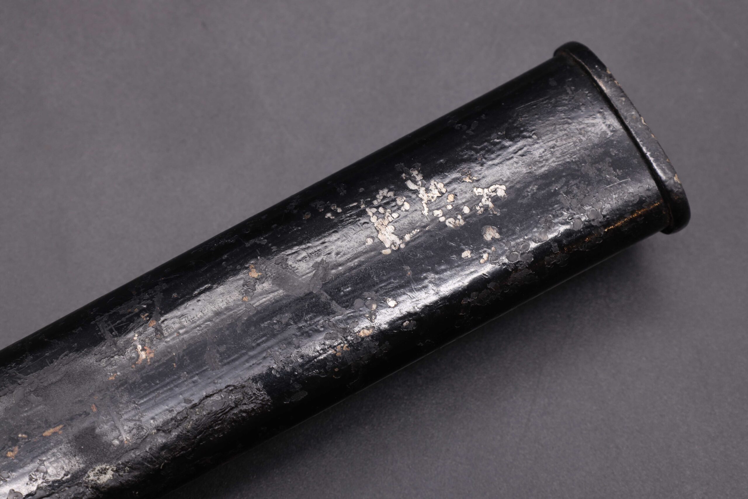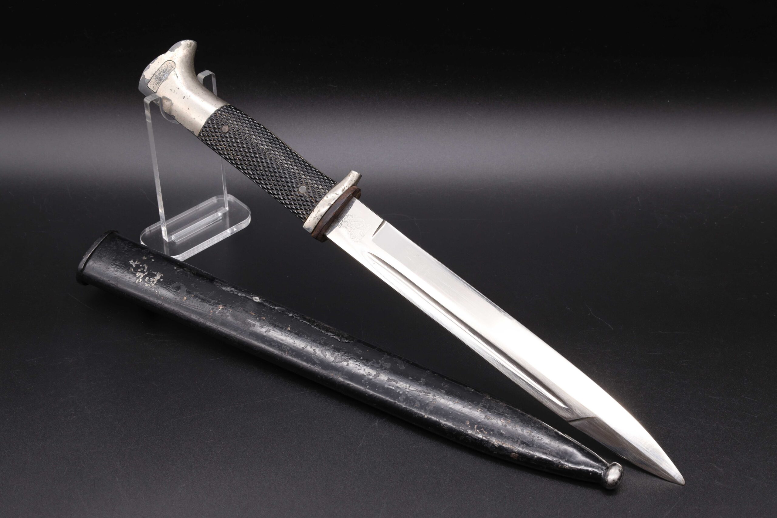 Worn condition German WW2 dress bayonet made by Eickhorn. Note the hilt hook is broken off and the bayonet is the short model but the scabbard is for the long model. Nickel plated zinc hilt. Black bakelite grip plates held on by two steel rivets. The grip plate on the backside has two cracks. Clean short model nickel plated steel blade, stamped on the backside with the Carl Eickhorn makers mark. Leather buffer pad in place. Repainted black steel scabbard, long model.