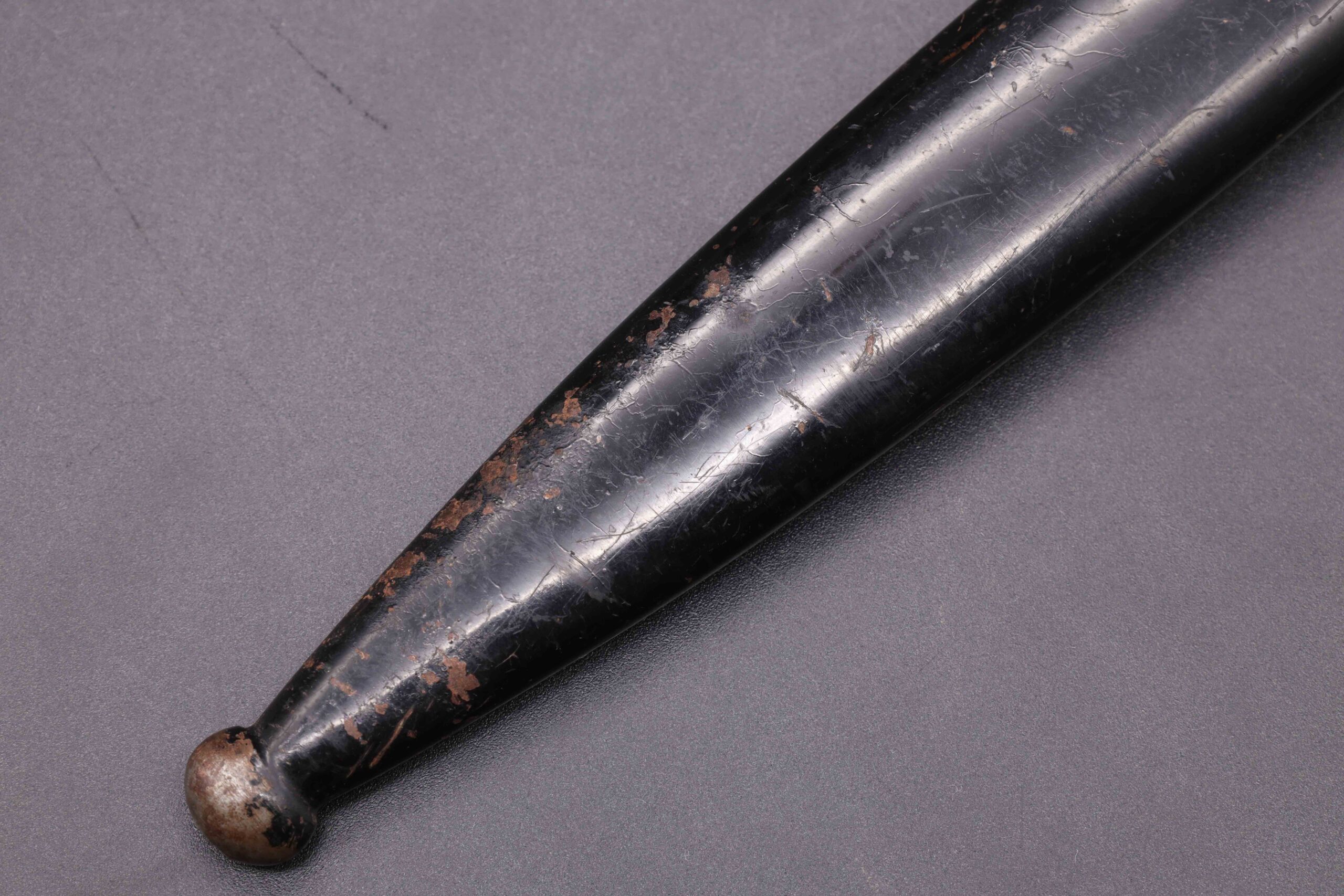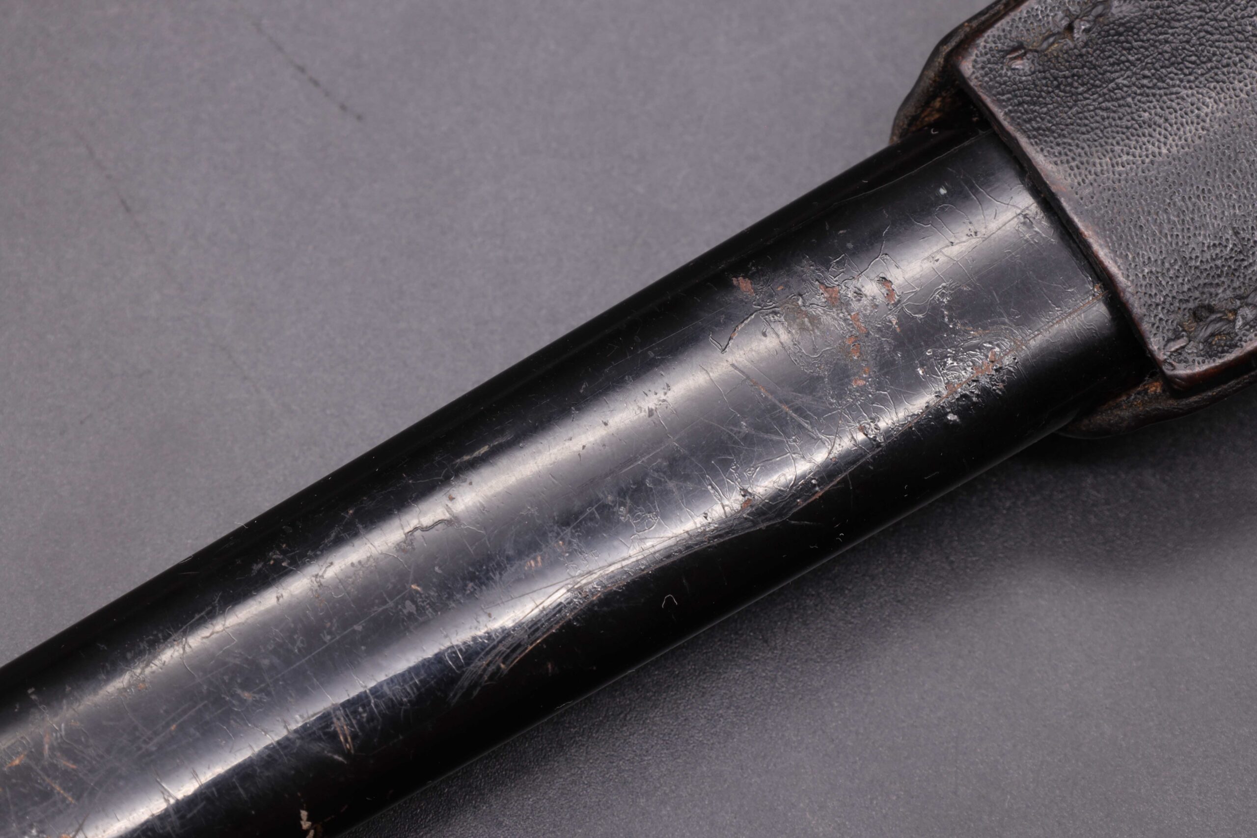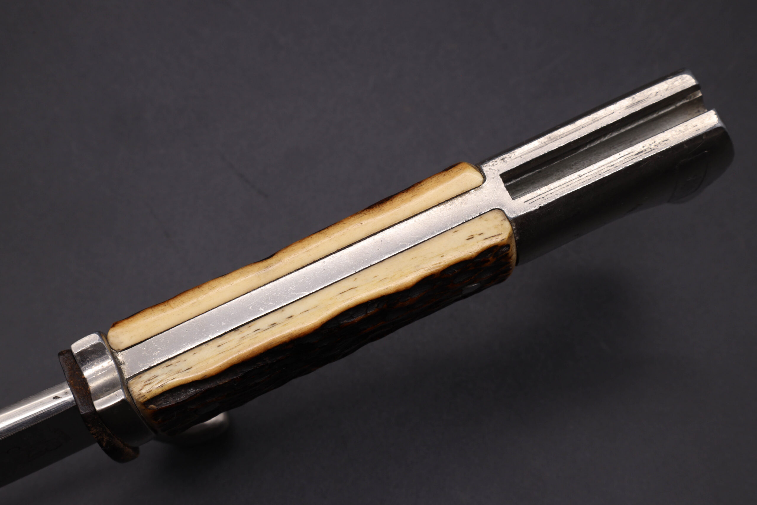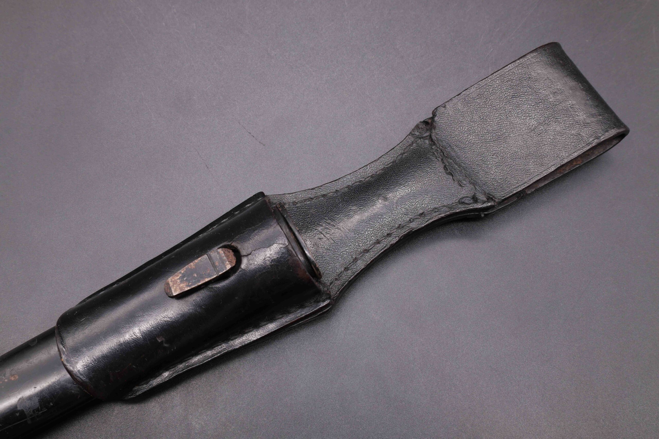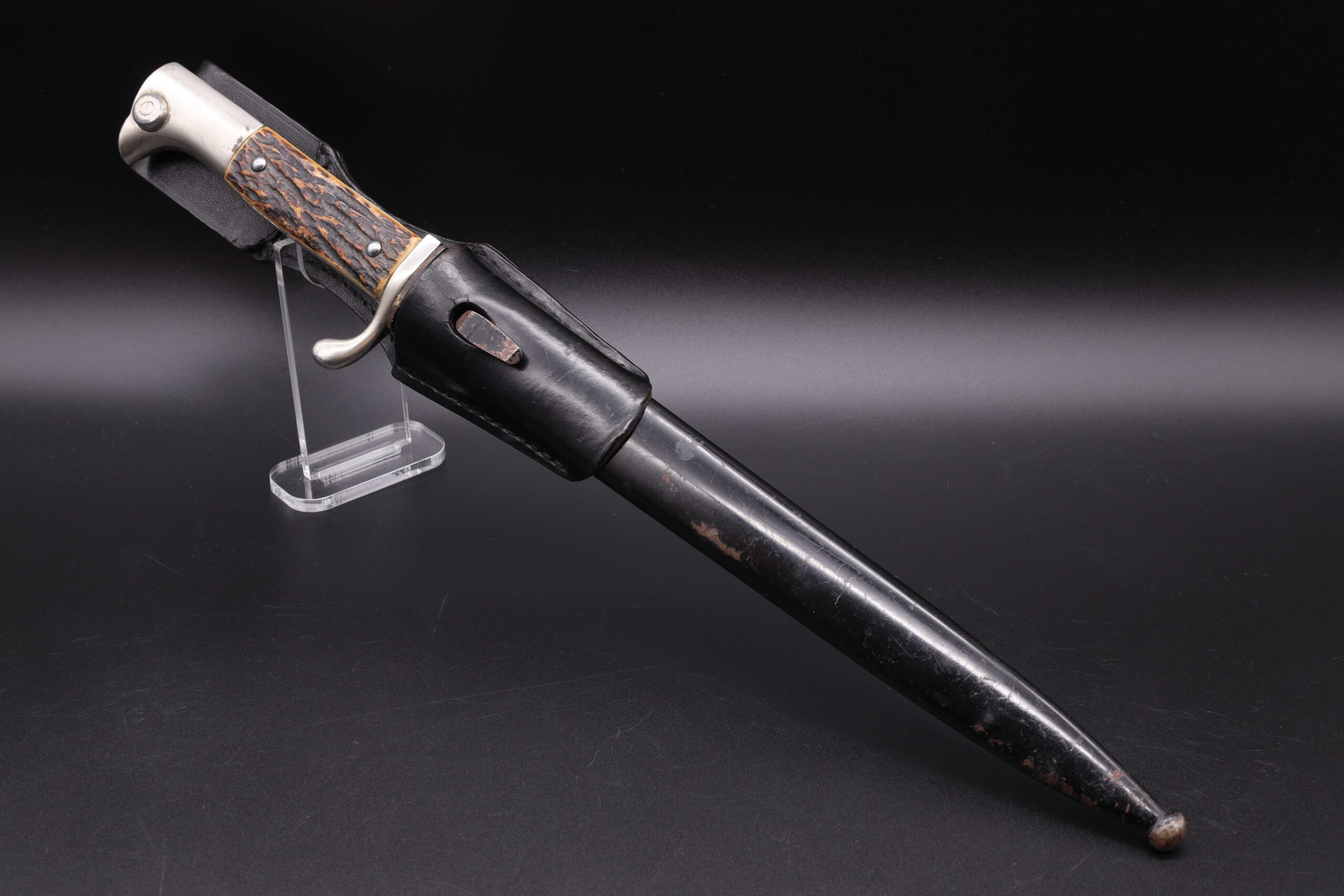 German WW2 dress bayonet with etched blade and stag horn grip made by Eickhorn. The bayonet is the long model with a total length of 40cm. It has a nickel plated zinc hilt, stag horn grip plates held on by two steel rivets. The clean nickel plated steel blade has the textbook Eickhorn Wehrmacht etch panel on the front, reading “Zur Erinnerung an meine Dienstzeit”. The backside is stamped on the ricasso with the Eickhorn maker’s mark. The leather buffer pad is in place. The original black painted steel scabbard is in good condition showing light wear. Attached to the scabbard is a black leather frog.