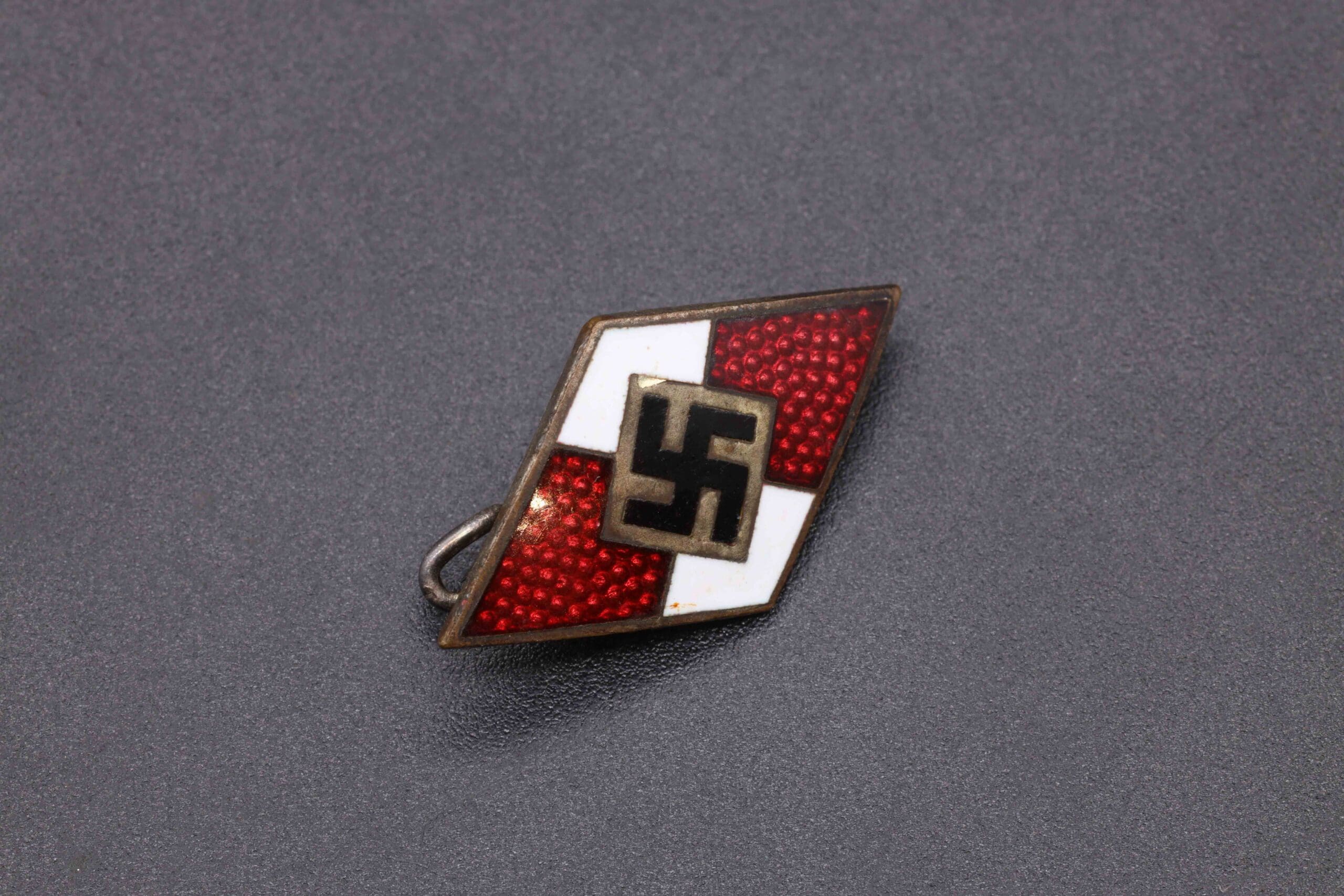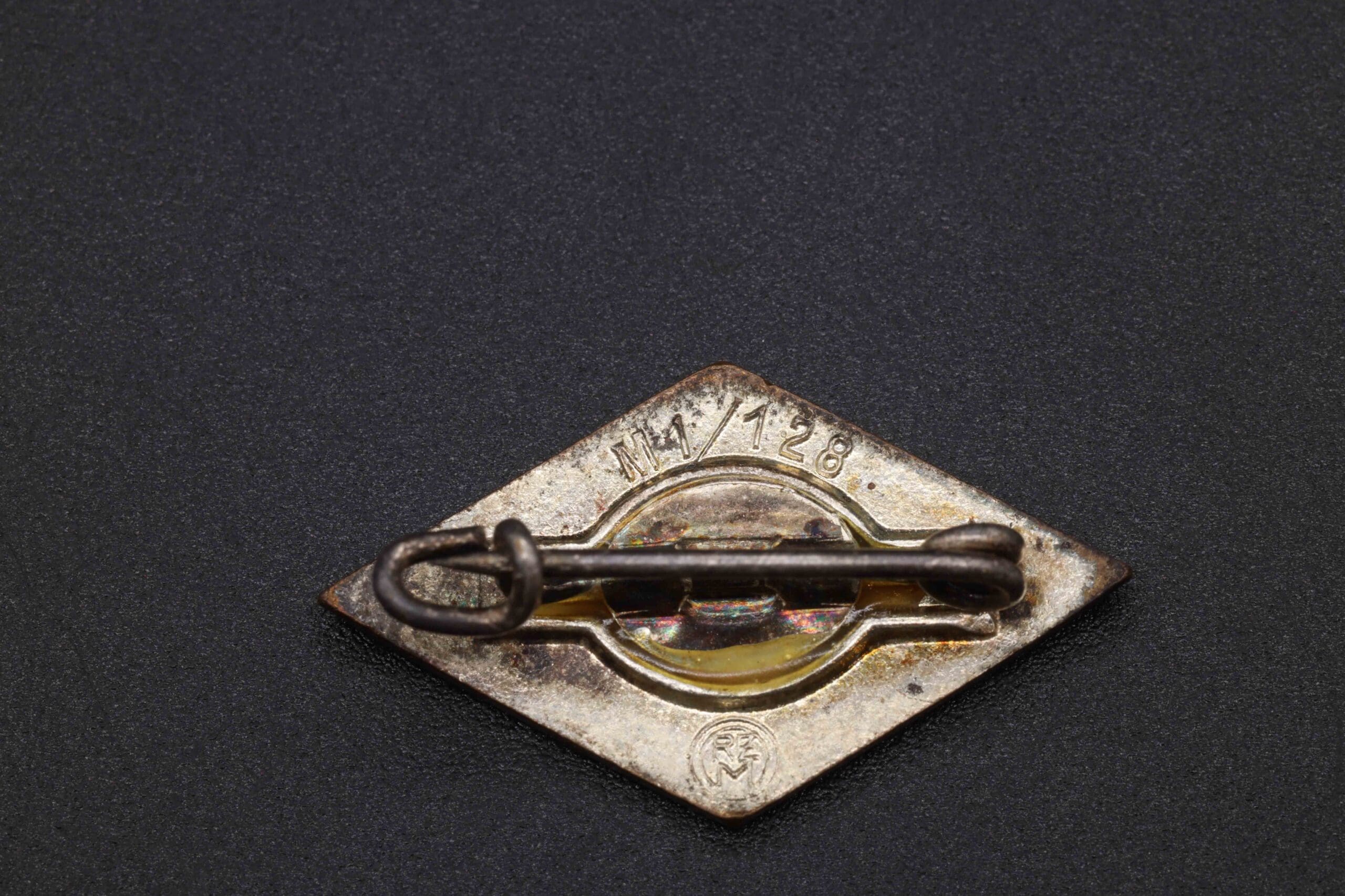 A very nice condition HJ diamond emblem. No cracks in the enamel, with a working pin on the backside. The RZM logo and “M1/128” are visible on the back.