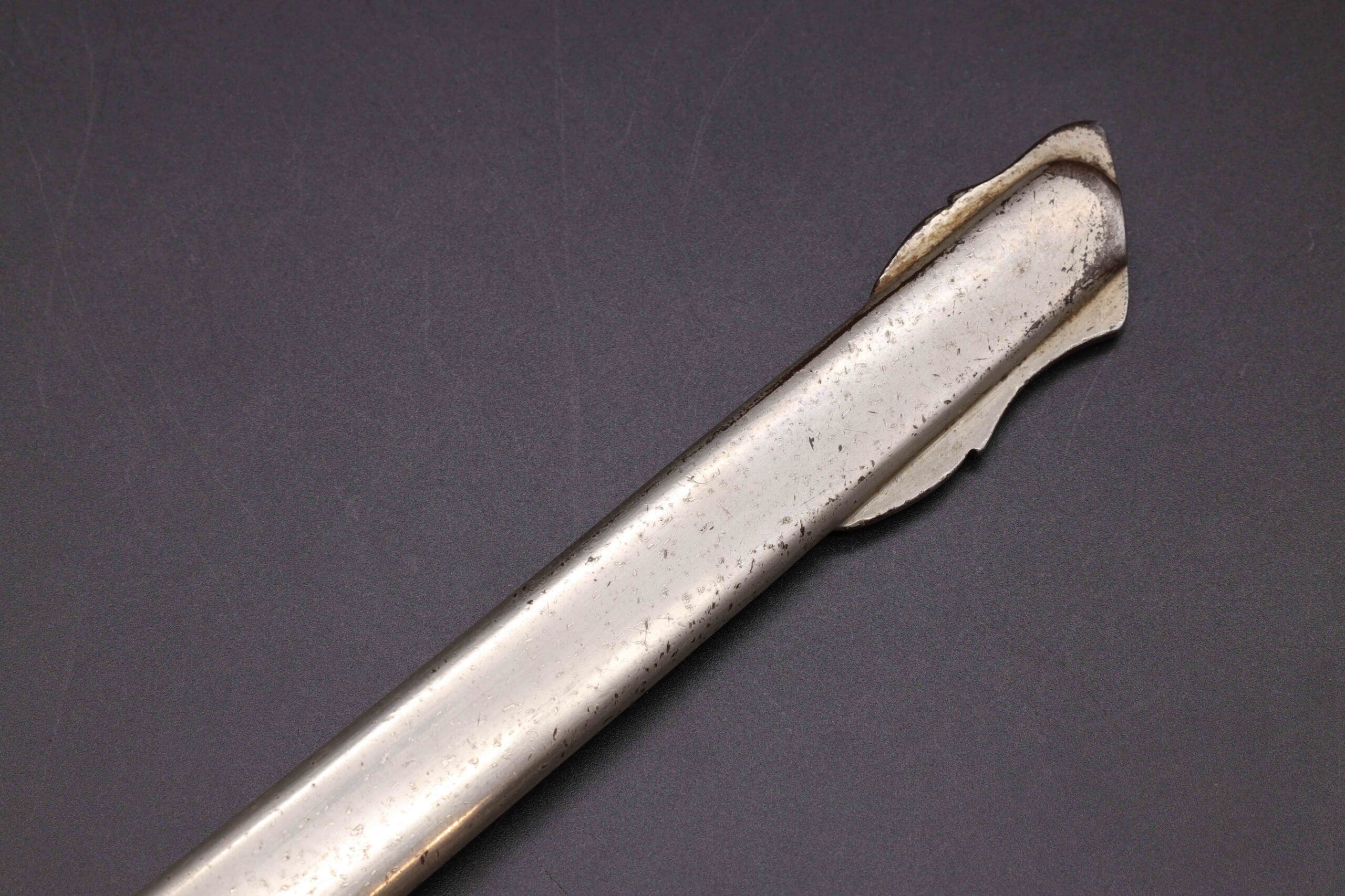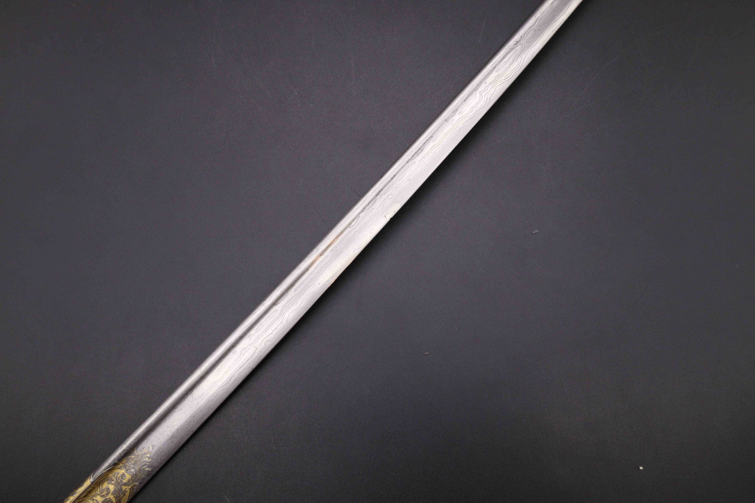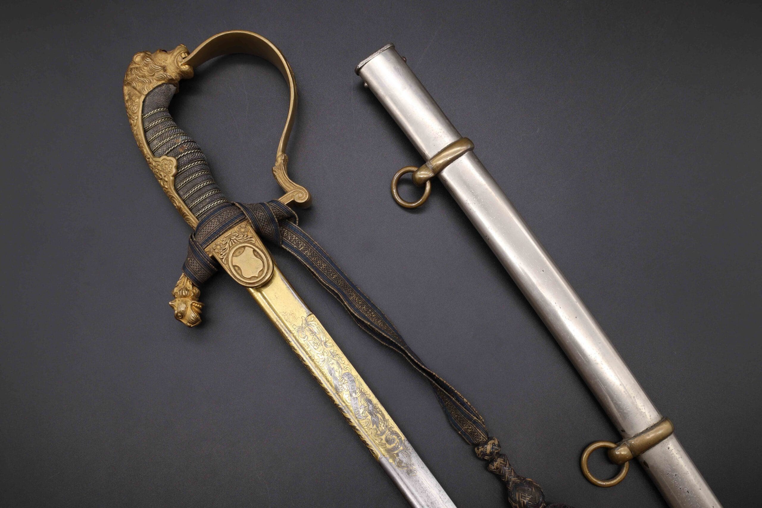 Elegant Löwenkopfsäbel retailed by E.W. Becher, Bonn, featuring a pattern-welded Damascus (Damaststahl) blade with frosted gilt panels and a gilt/decorated spine stamped to the retailer. Gilt-brass hilt with lion-head pommel and matching lion-head quillon; sharkskin grip with triple wire. Oval langet with crossed trophies points to artillery ownership. Complete with the original nickel-plated steel scabbard (two rings) and the rare officer’s portepee. Condition: very good—strong gilding and crisp Damascus pattern; light handling and honest scabbard wear. A high-grade, parade-quality Kaiserzeit officer’s saber.