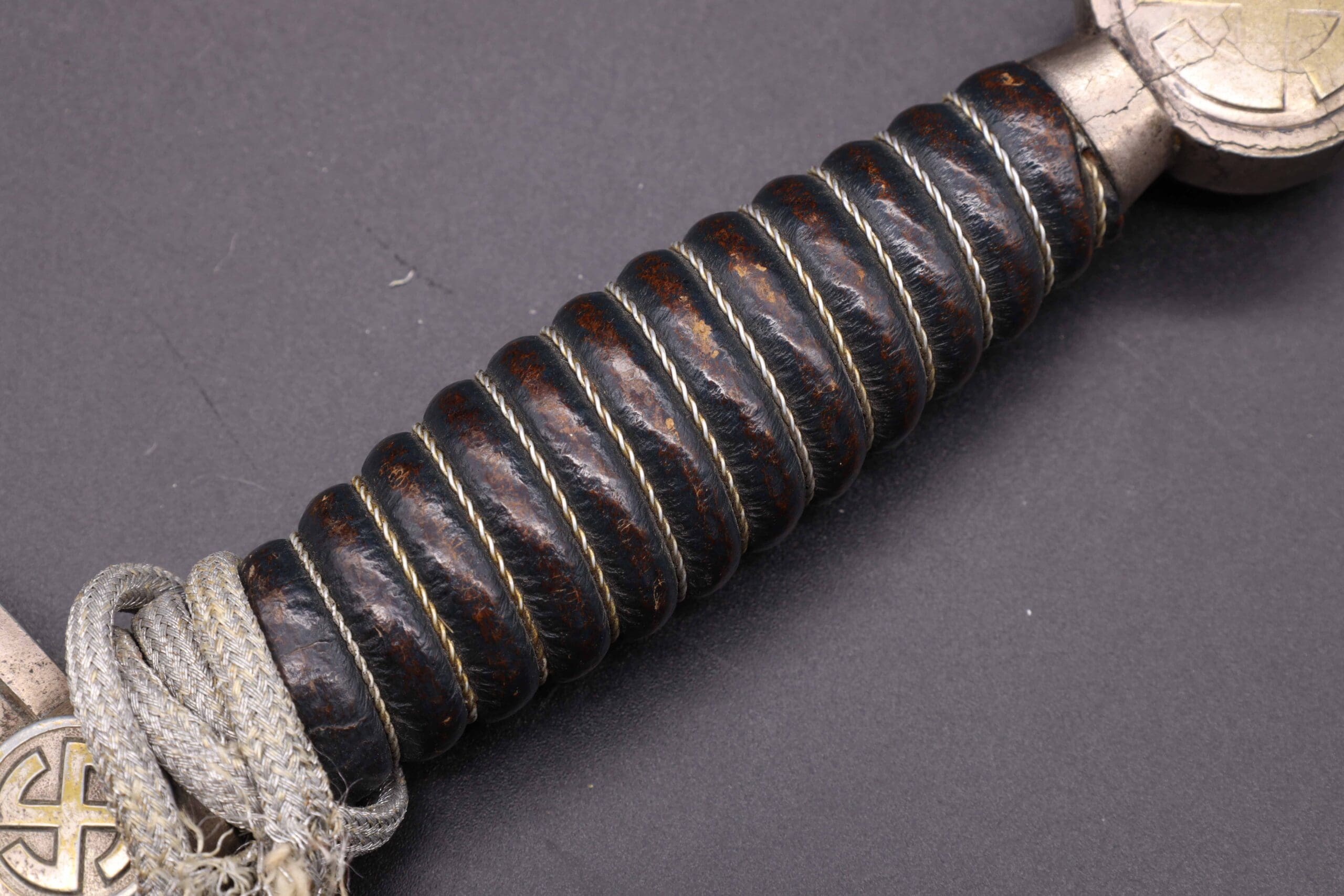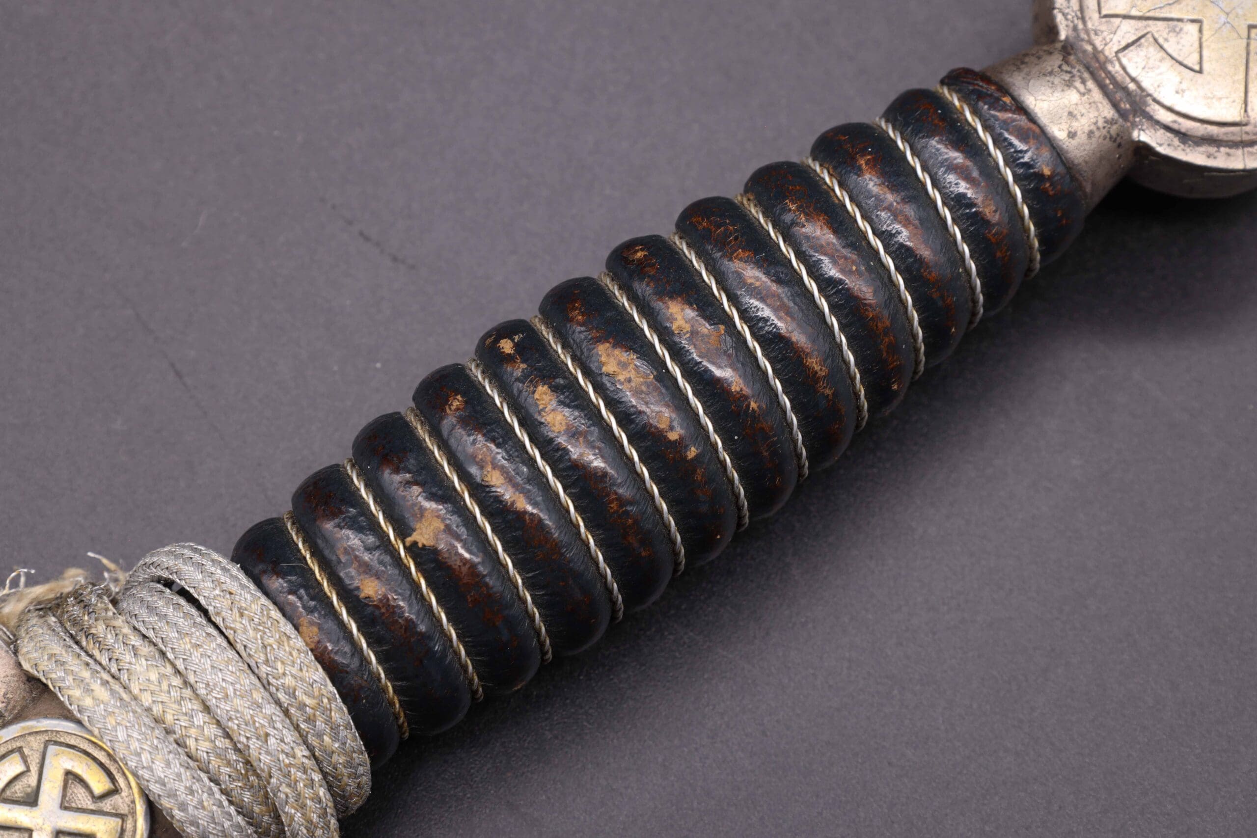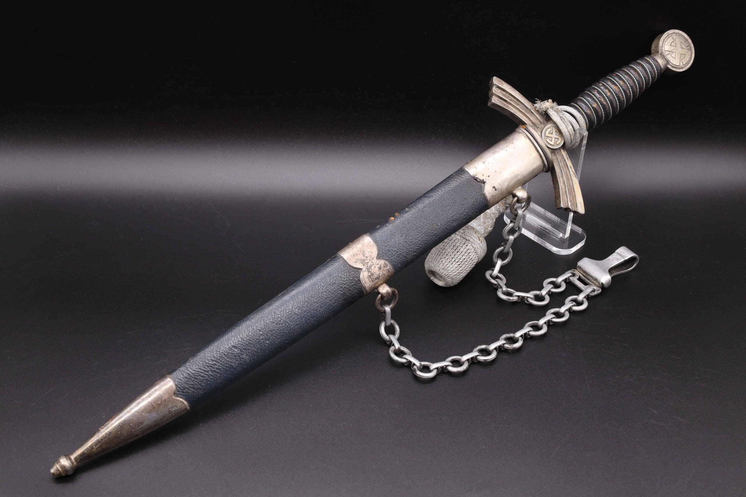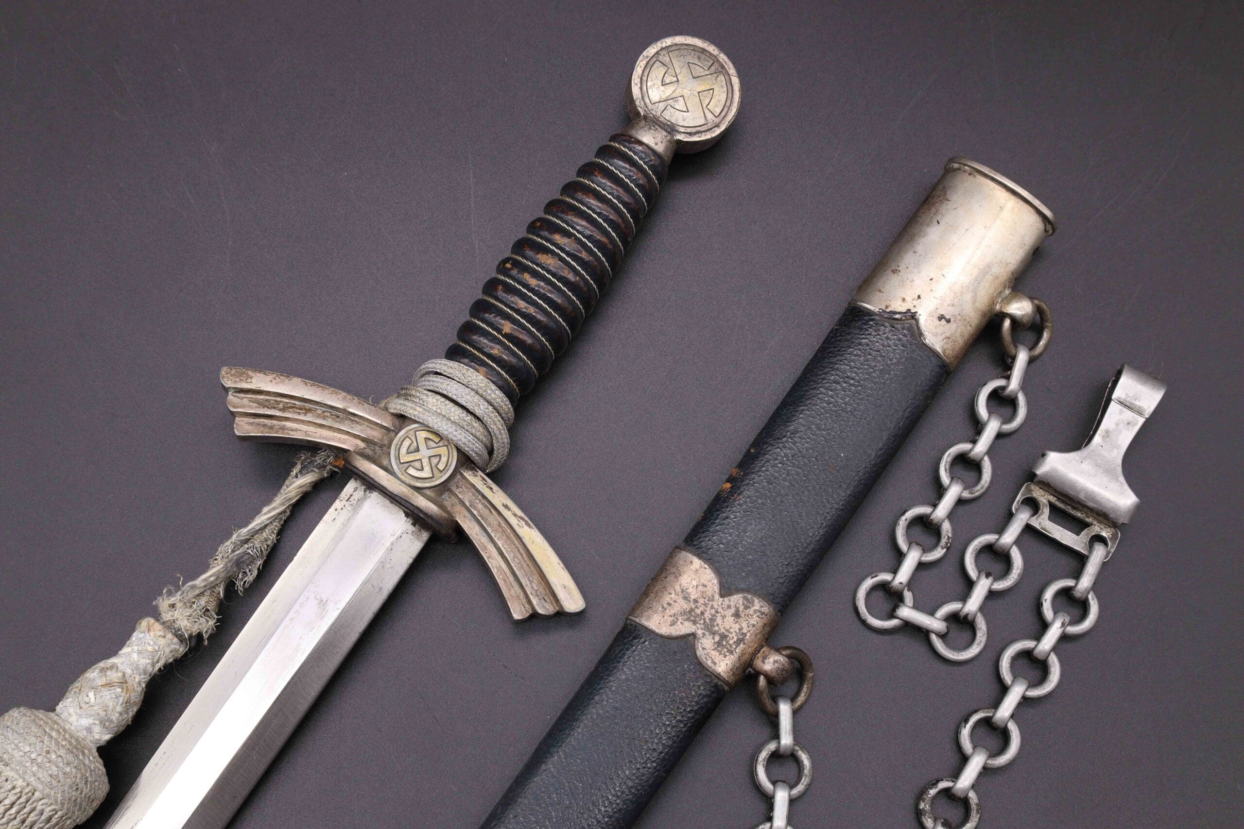 Worn condition 1st model Luftwaffe dagger made by Robert Klaas. Blue leather covered wooden girp with in tact grip wiring. Zinc pommel screw with a lot of cracks. Zinc cross guard. Nickel plated steel blade stamped with the Robert Klaas Logo. Blue leather covered steel scabbard with steel scabbard fittings. All five screws are in place and untouched. Aluminum chain and clip stamped “Ges.Gesch.” and “oLc”. The dagger comes complete with a worn out short silver Luftwaffe portepee. An original WW2 dagger in worn condition.