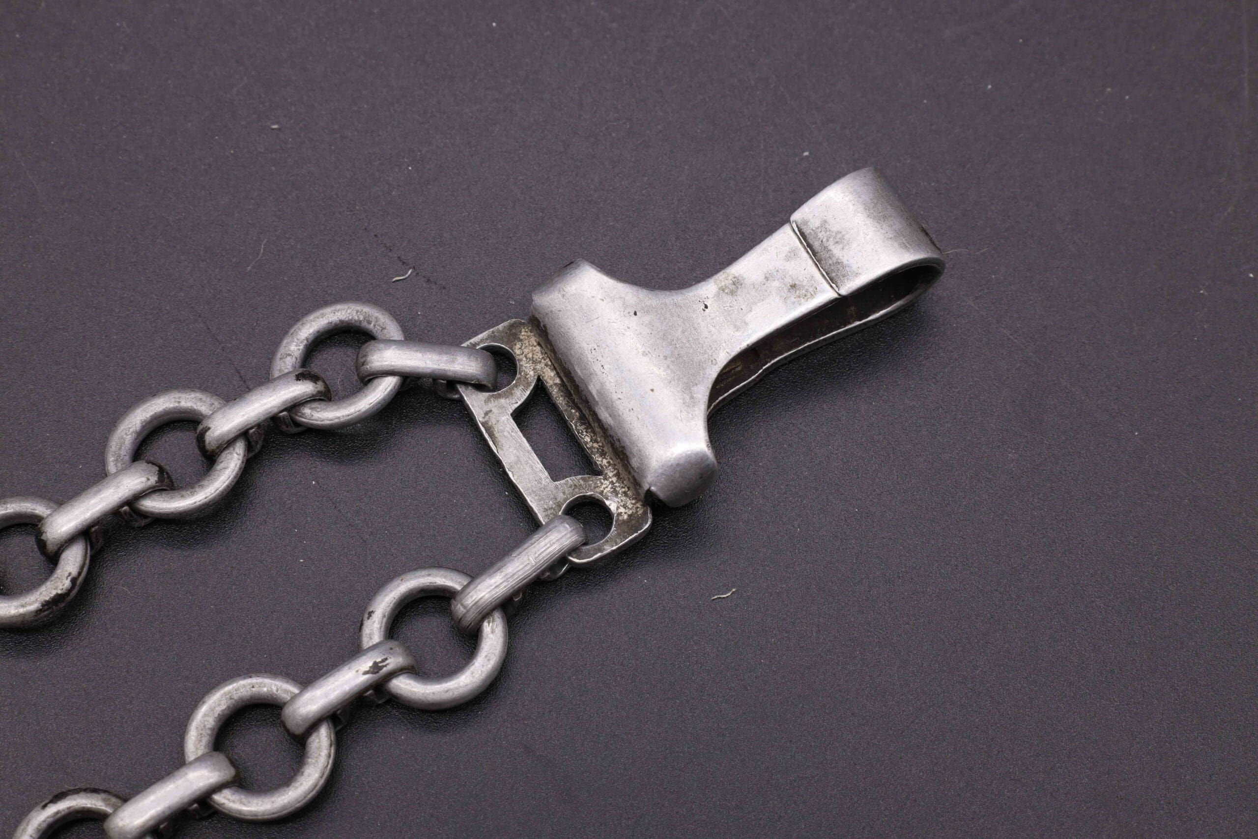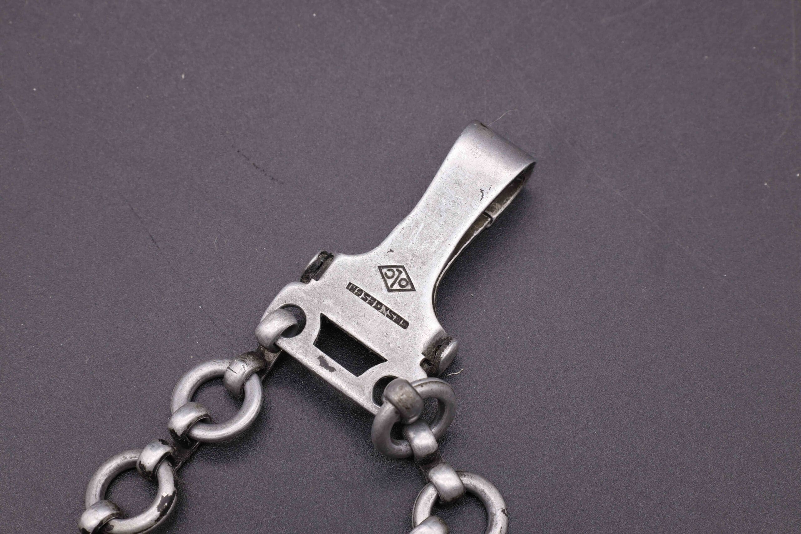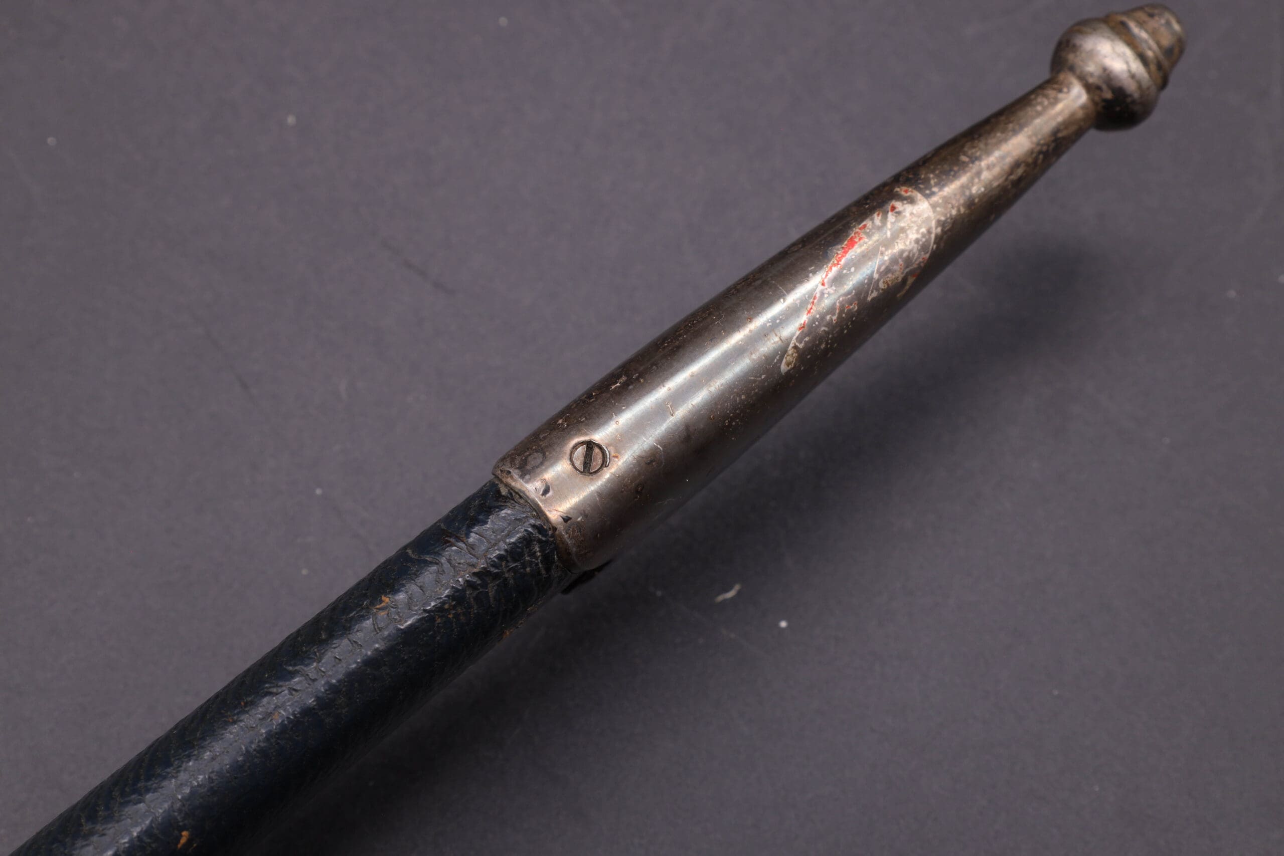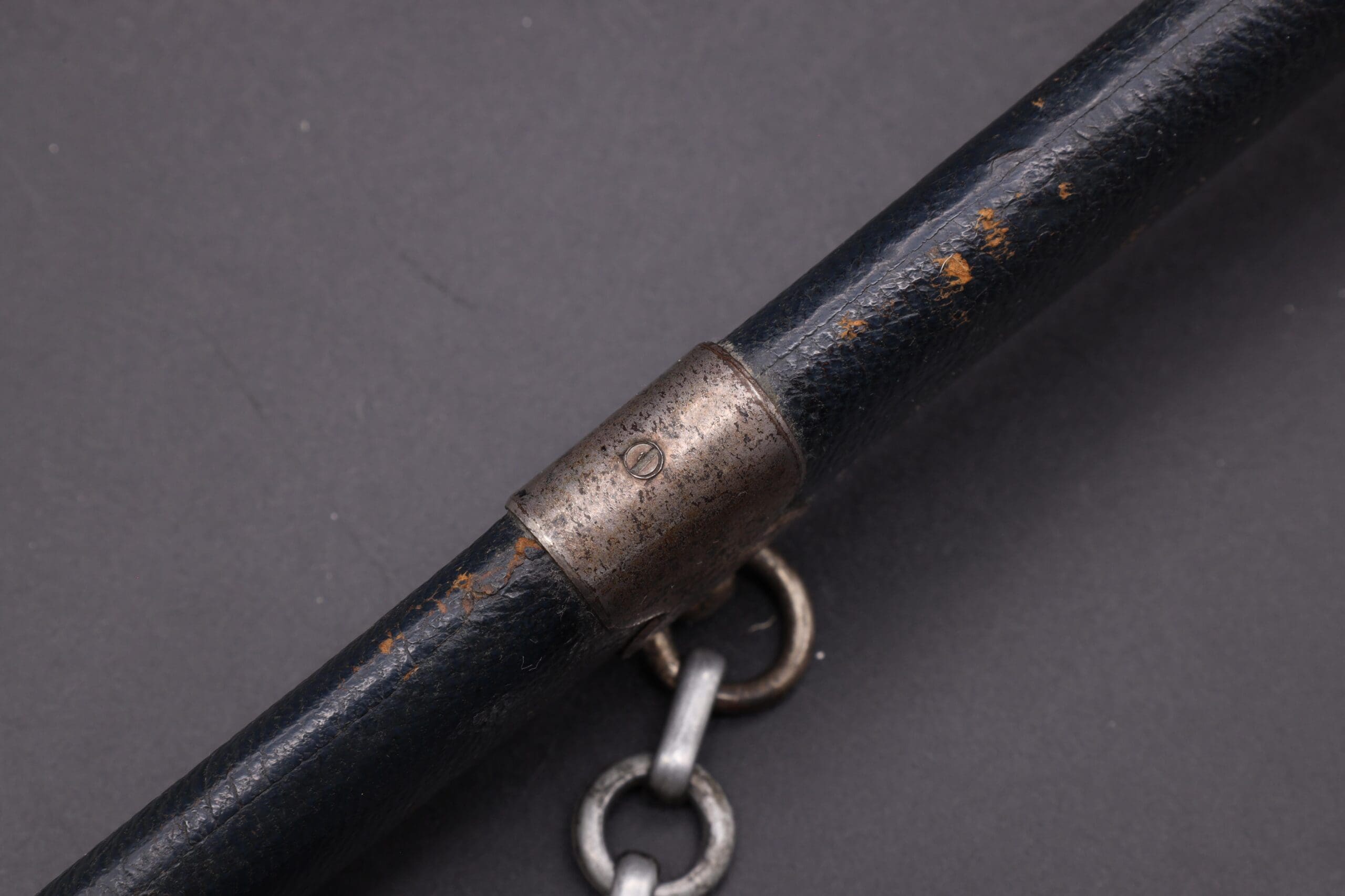 Worn condition 1st model Luftwaffe dagger made by Robert Klaas. Blue leather covered wooden girp with in tact grip wiring. Zinc pommel screw with a lot of cracks. Zinc cross guard. Nickel plated steel blade stamped with the Robert Klaas Logo. Blue leather covered steel scabbard with steel scabbard fittings. All five screws are in place and untouched. Aluminum chain and clip stamped “Ges.Gesch.” and “oLc”. The dagger comes complete with a worn out short silver Luftwaffe portepee. An original WW2 dagger in worn condition.