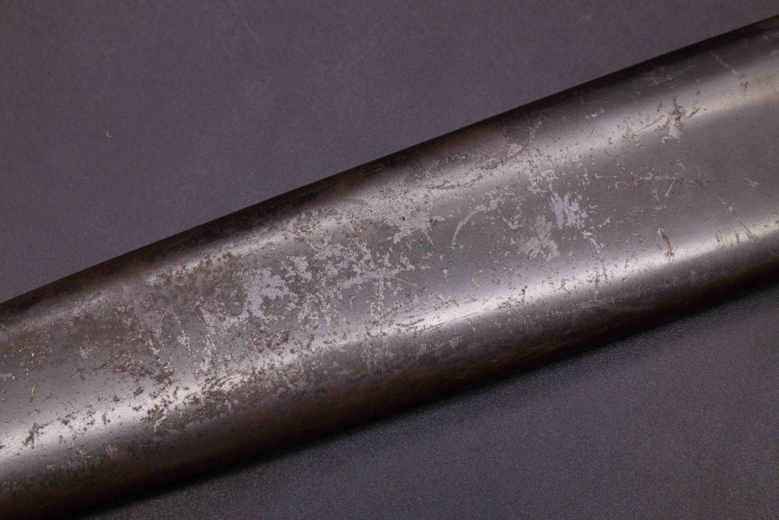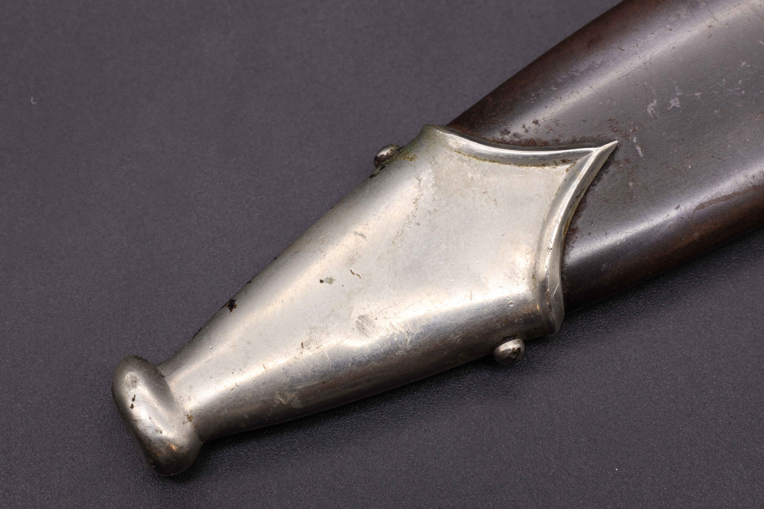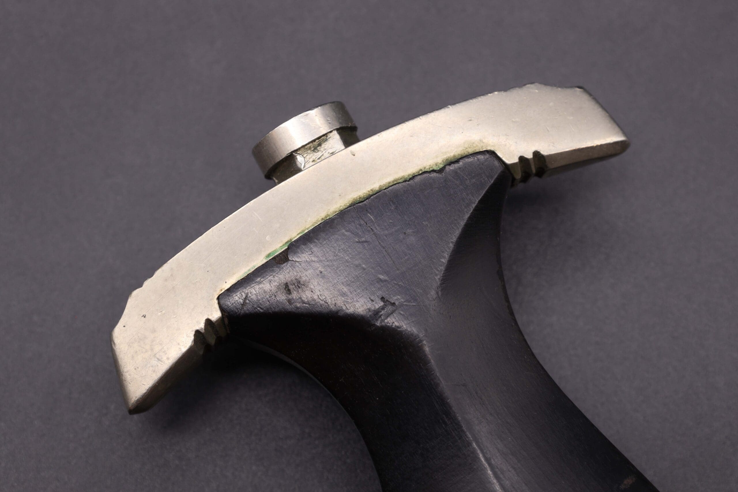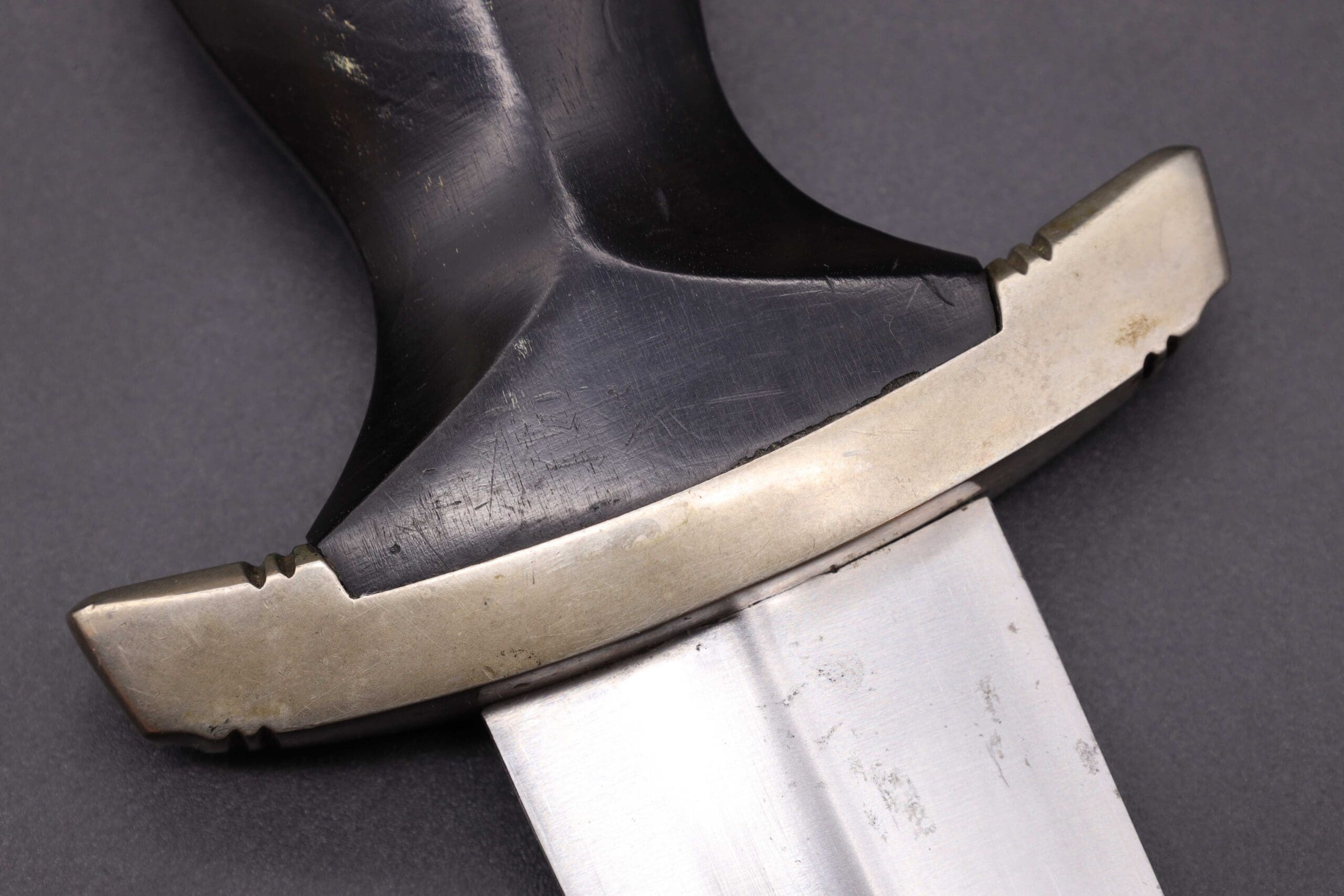 M33 early production SS dagger made by Gottlieb Hammesfahr. Nickel silver cross guards. Bottom one is stamped with the roman number “III”. Black wooden grip with nickel silver grip eagle and SS roundel. The grip has some wood chipping at the top and the SS roundel is inlayed at a 70° angle. Clean steel blade showing cross grain and light corrosion spots. The frontside of the blade is etched with the SS motto “Meine Ehre heist Treue”. The backside of the blade is etched with the Gottlieb Hammesfahr Solingen-Foche logo. Black anodized steel scabbard with nickel silver scabbard fittings. All four screws are in place. The bottom fitting is split on one side near the bottom. A very nice decent condition SS dagger.