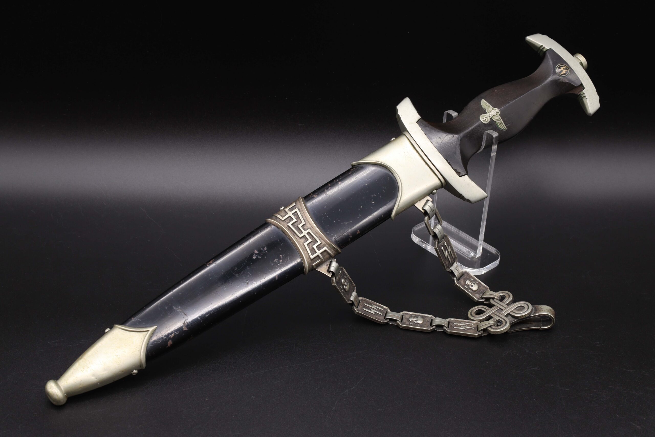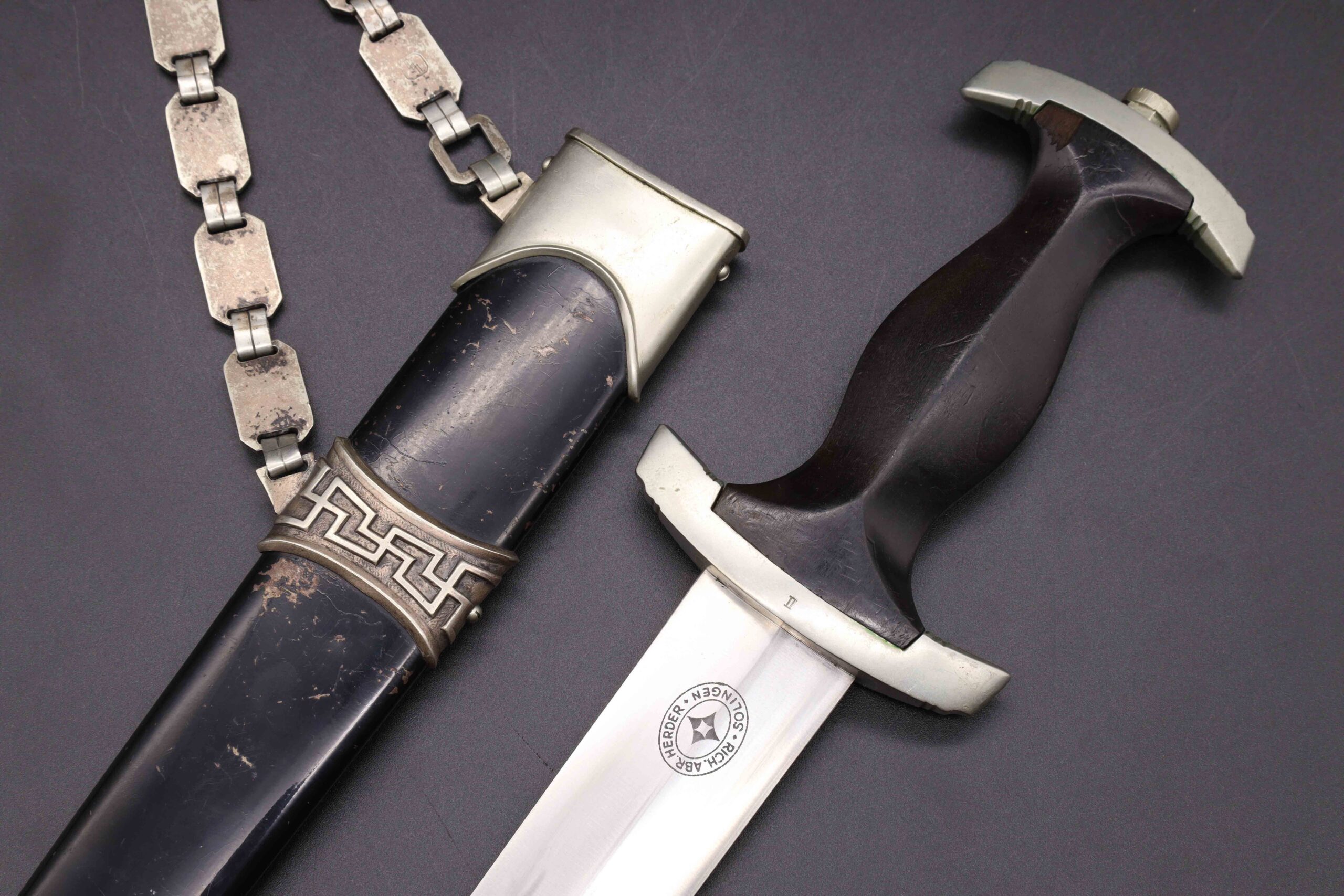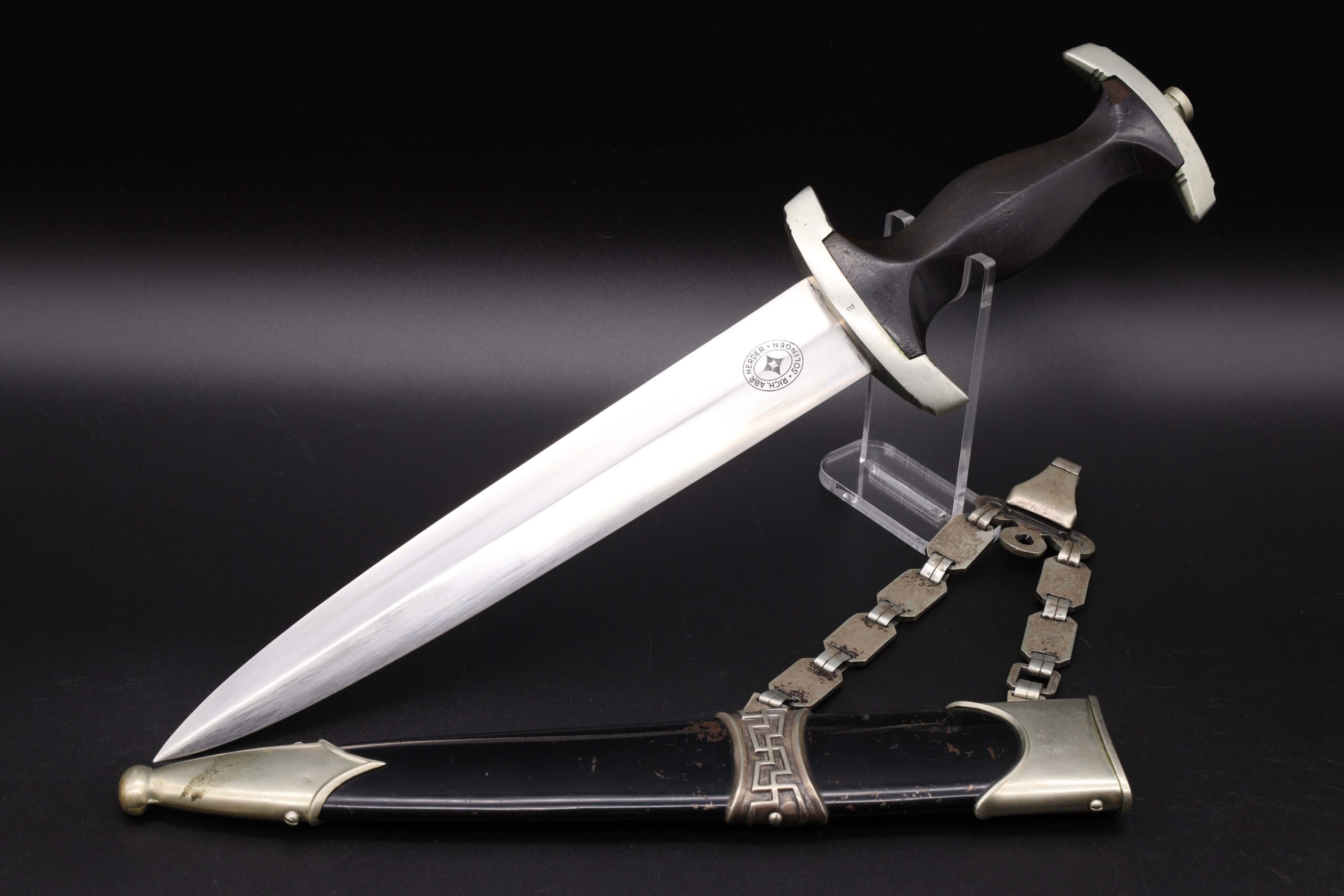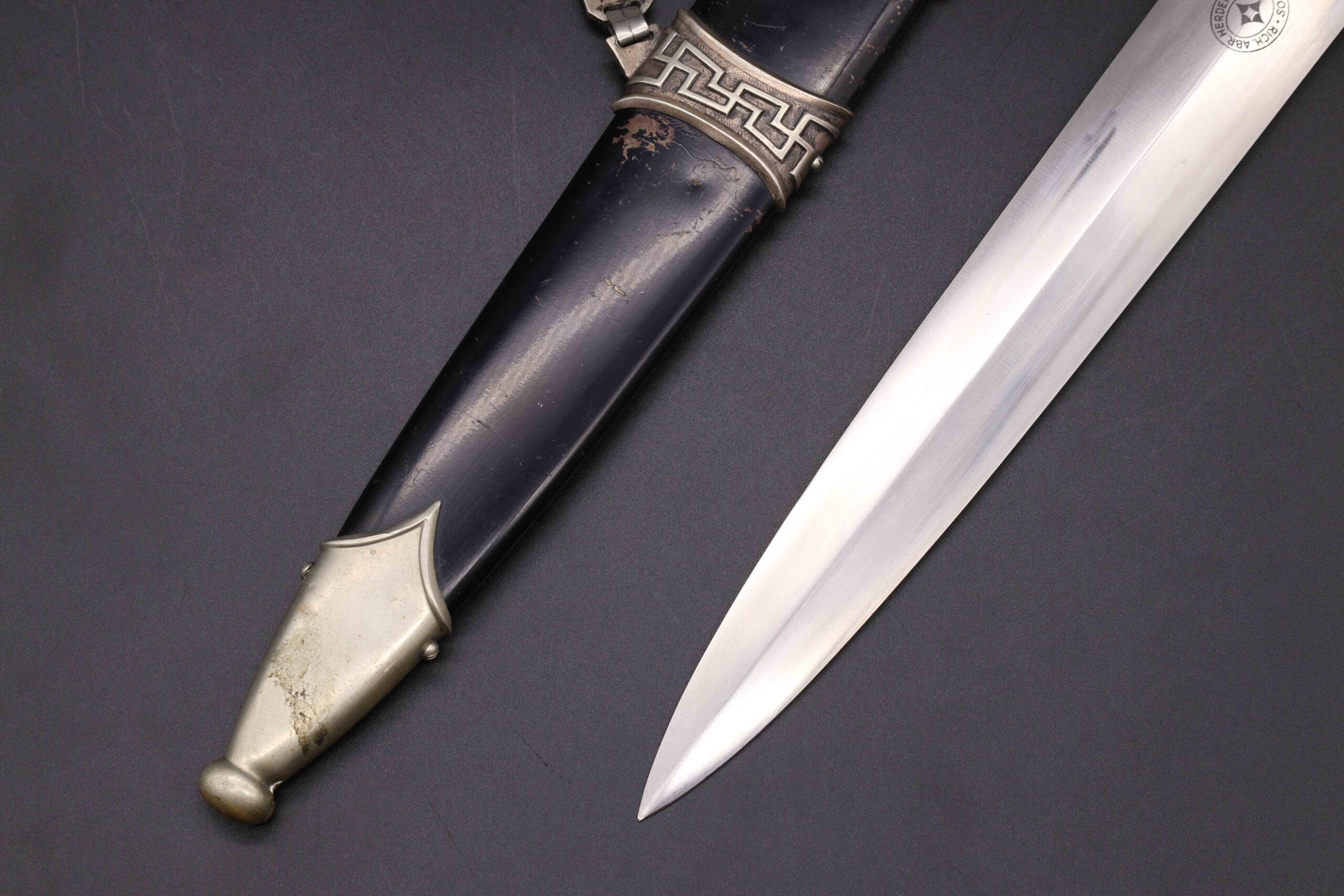 Early production M36 chained SS dagger. The blade is maker marked by Richard Herder. M36 SS daggers have only been produced without a maker’s mark, so this one having a maker’s mark shows that this is a transformed M33 dagger, where the SS member became officer and changed his M33 scabbard for a M36 one. The fitting between the scabbard and the dagger is fantastic, and the patina is also nicely matching. The dagger has nickel silver cross guards, the bottom one stamped with the roman number 2. The black wooden grip has a nickel silver grip eagle and SS roundel, with most of the black enamel still inside. There are two chips in the grip on the top, front and back. The steel blade is in great condition showing cross grain on both sides. The frontside of the blade is etched with the SS motto “Meine Ehre heist Treue”. The backside of the blade is etched with the makers mark “Rich. Abr. Herder Solingen”. I would call the condition of this blade “Mint”. The M36 scabbard has its original black paint and is fitted with nickel silver scabbard fittings and chain. All five screws are in place. The chain is type “B1”, nickel silver with no septum in the skulls. One link is stamped on the backside with the SS stamp. The snap clip is in working order. These early M36 SS daggers are hard to find!