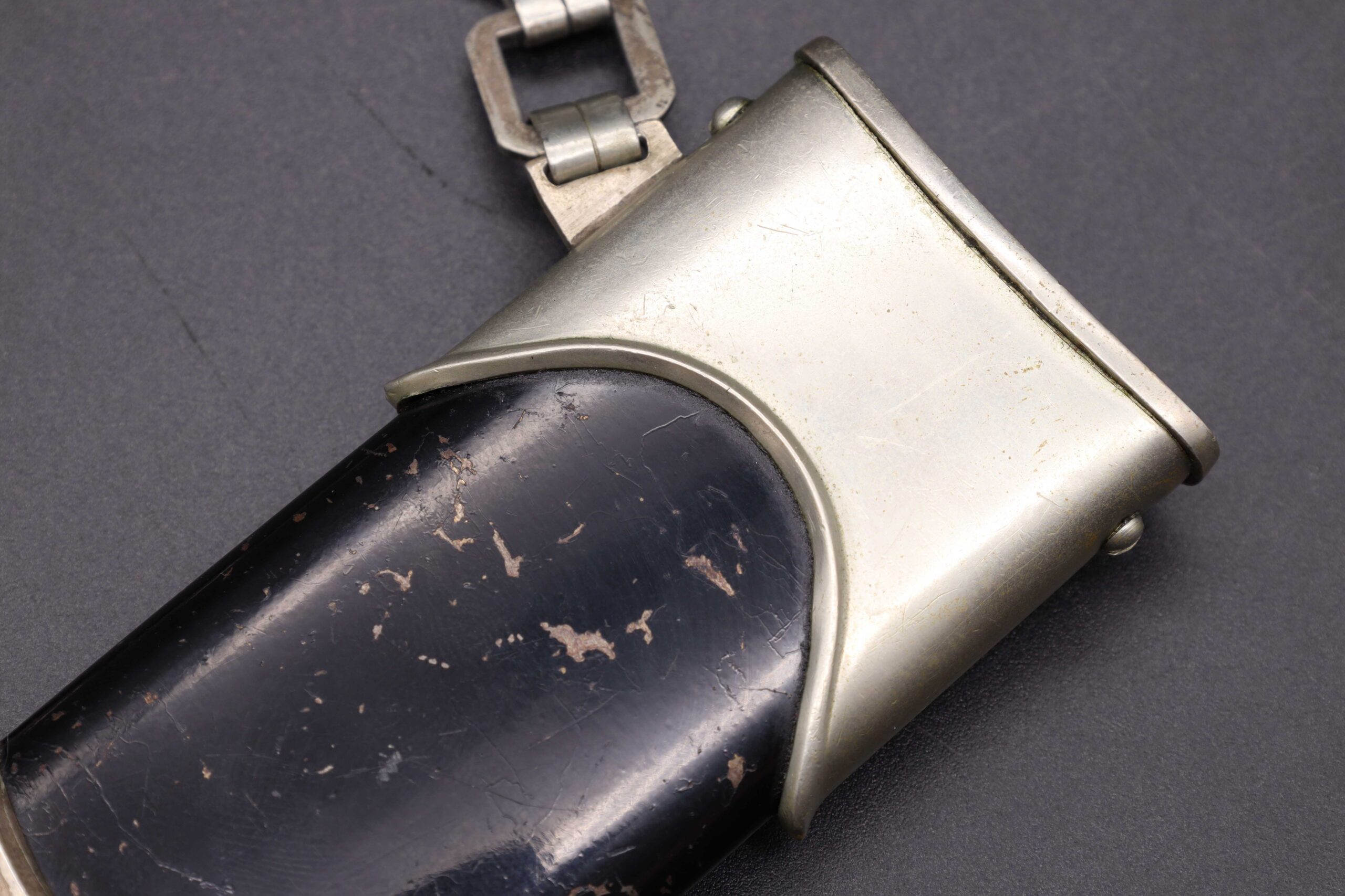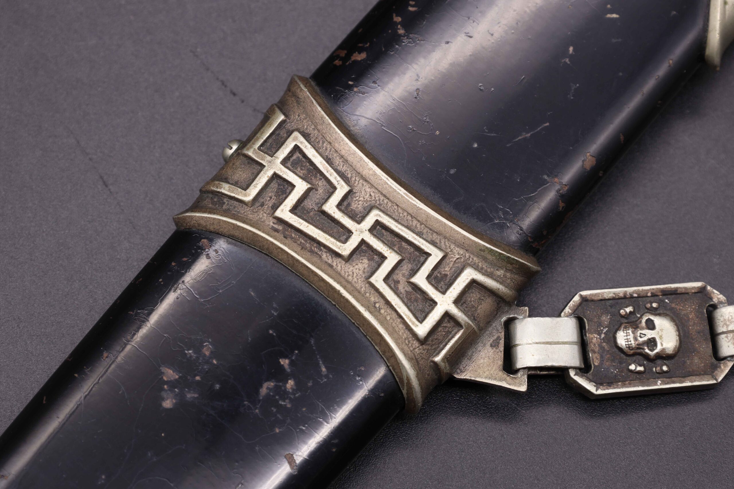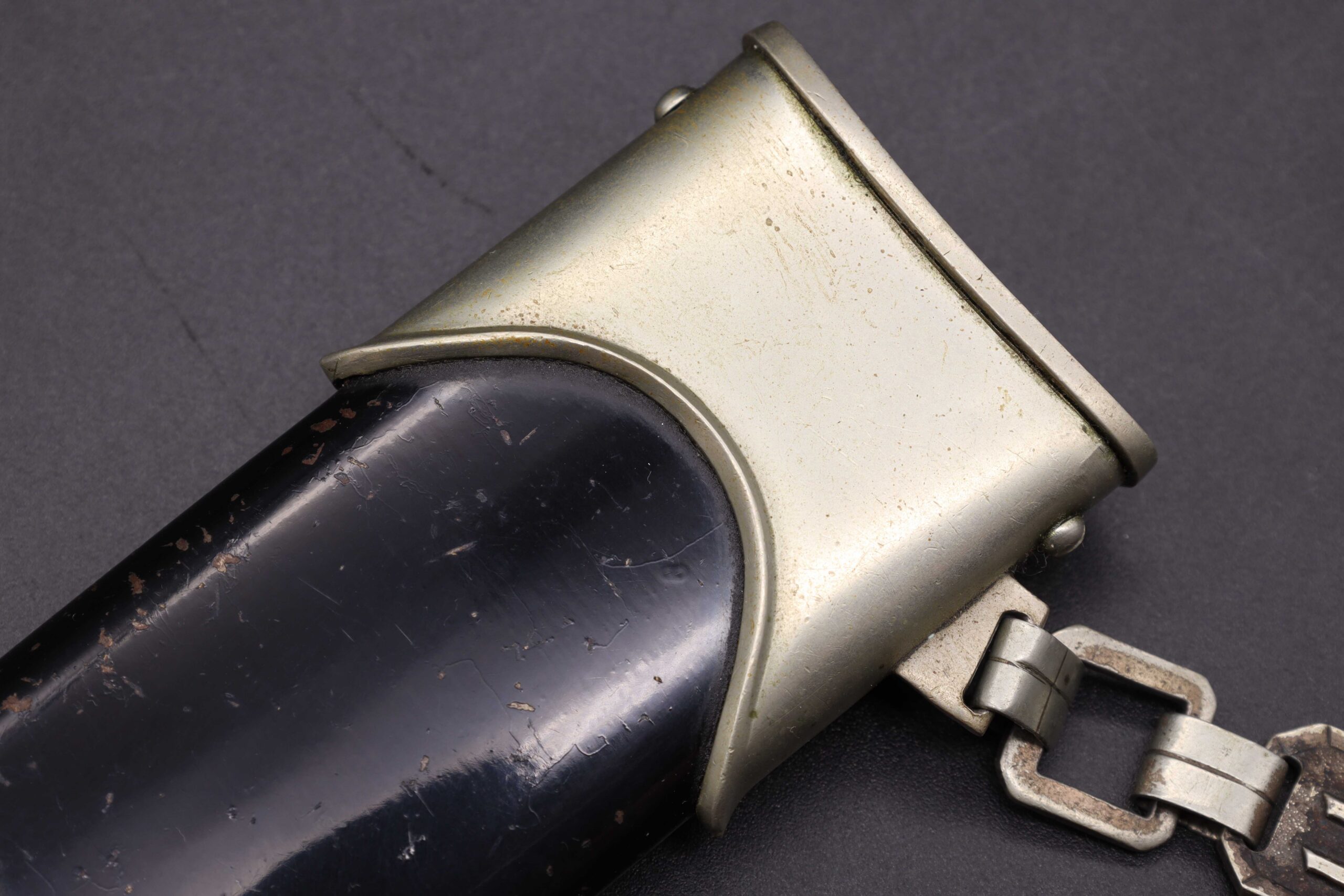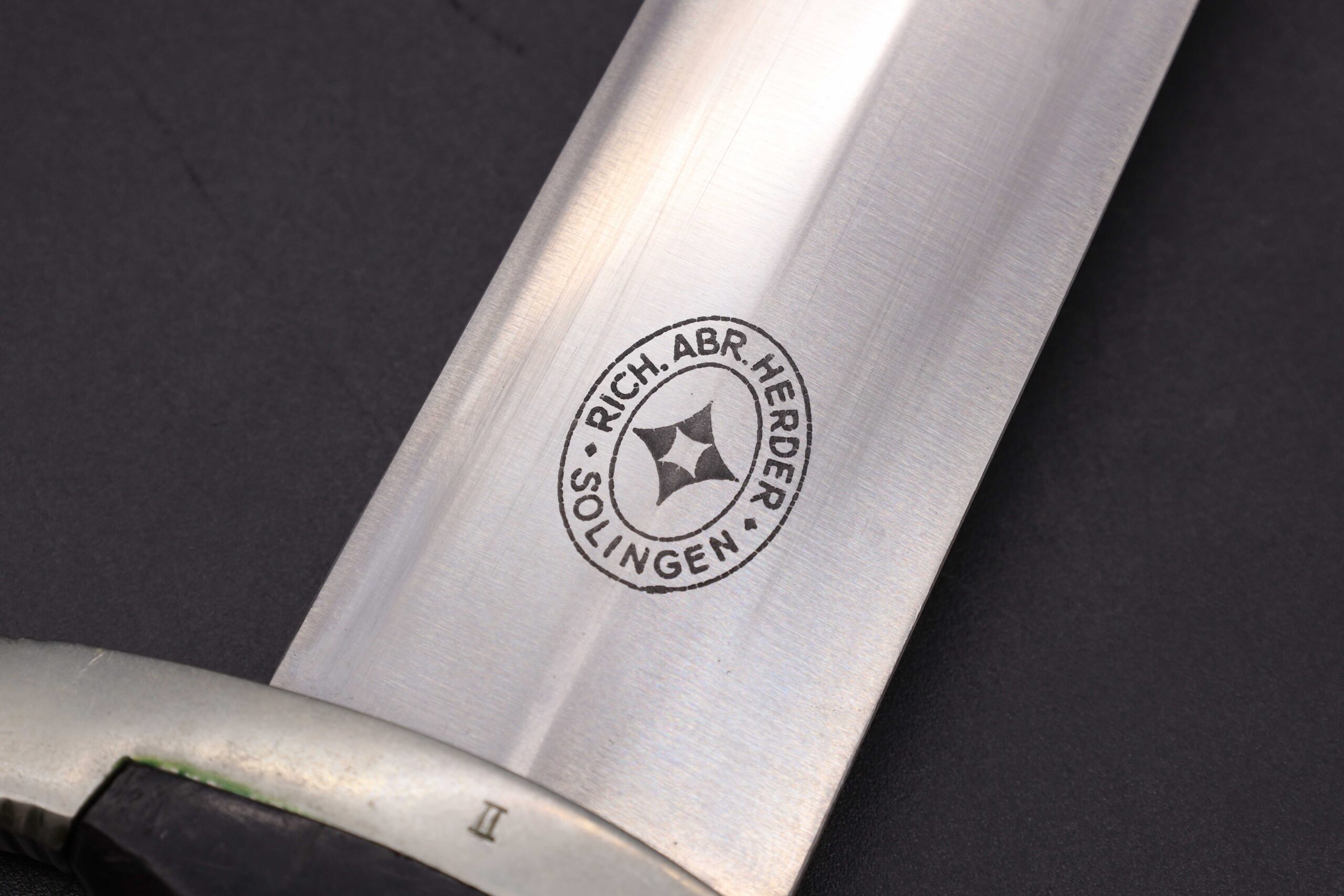 Early production M36 chained SS dagger. The blade is maker marked by Richard Herder. M36 SS daggers have only been produced without a maker’s mark, so this one having a maker’s mark shows that this is a transformed M33 dagger, where the SS member became officer and changed his M33 scabbard for a M36 one. The fitting between the scabbard and the dagger is fantastic, and the patina is also nicely matching. The dagger has nickel silver cross guards, the bottom one stamped with the roman number 2. The black wooden grip has a nickel silver grip eagle and SS roundel, with most of the black enamel still inside. There are two chips in the grip on the top, front and back. The steel blade is in great condition showing cross grain on both sides. The frontside of the blade is etched with the SS motto “Meine Ehre heist Treue”. The backside of the blade is etched with the makers mark “Rich. Abr. Herder Solingen”. I would call the condition of this blade “Mint”. The M36 scabbard has its original black paint and is fitted with nickel silver scabbard fittings and chain. All five screws are in place. The chain is type “B1”, nickel silver with no septum in the skulls. One link is stamped on the backside with the SS stamp. The snap clip is in working order. These early M36 SS daggers are hard to find!