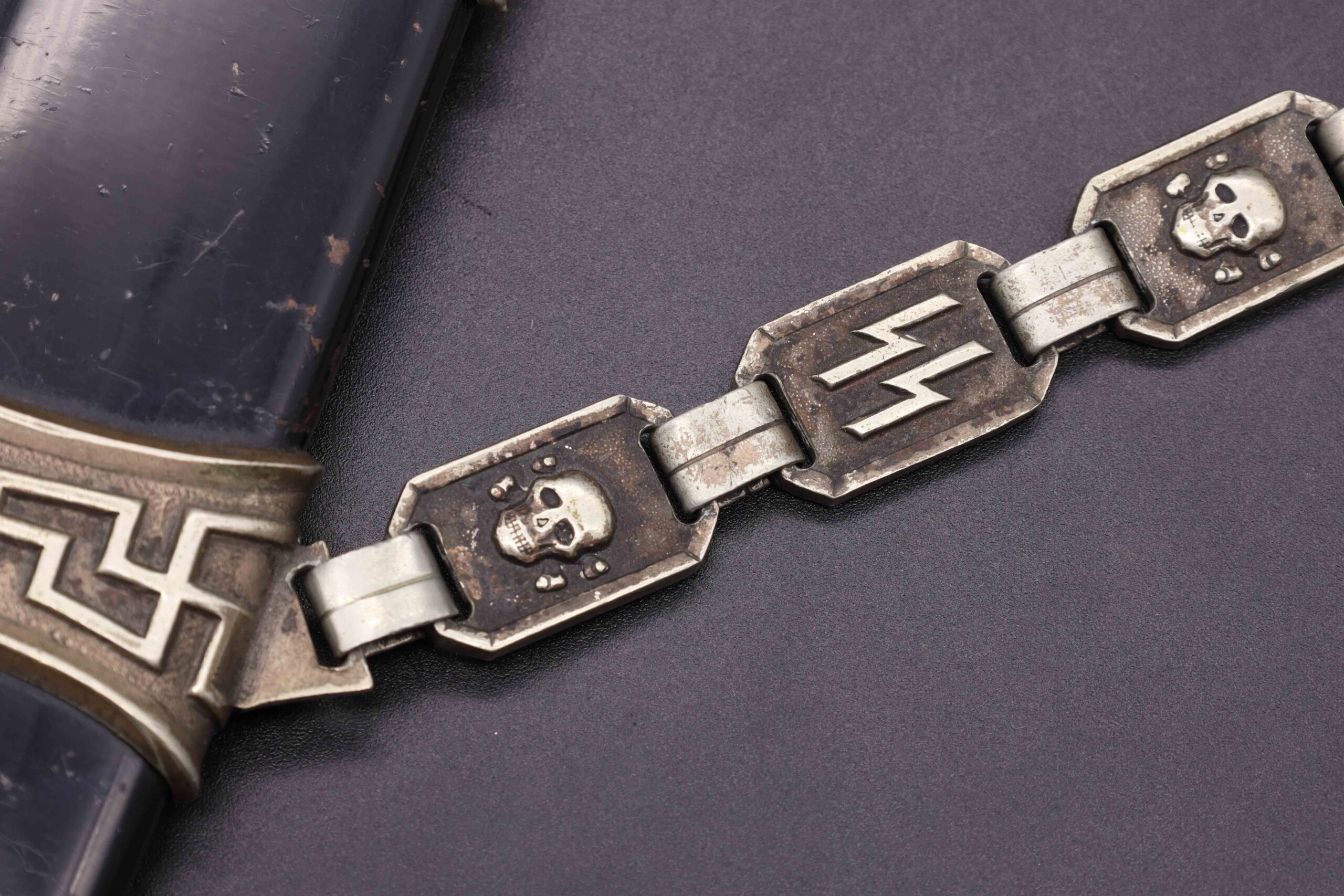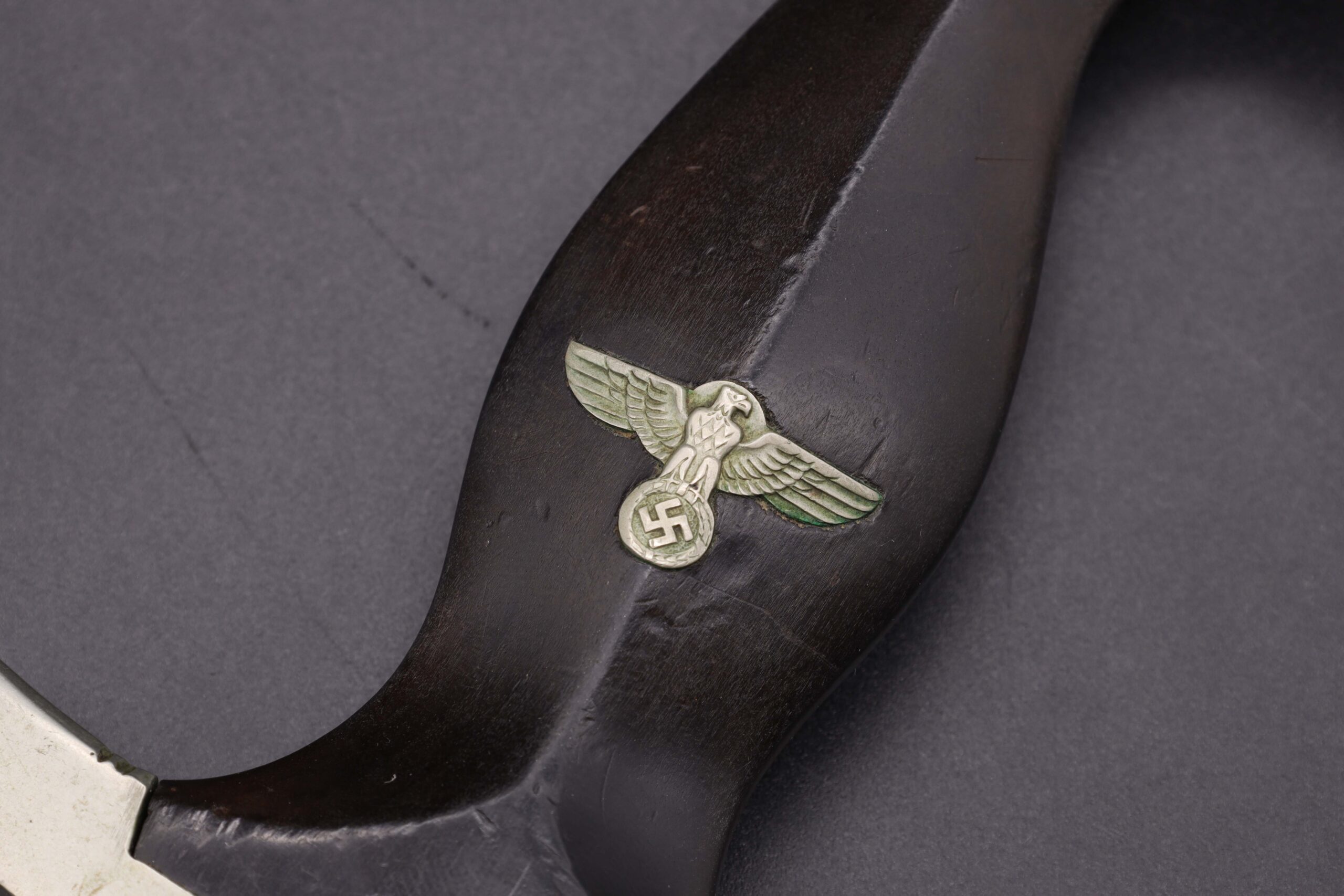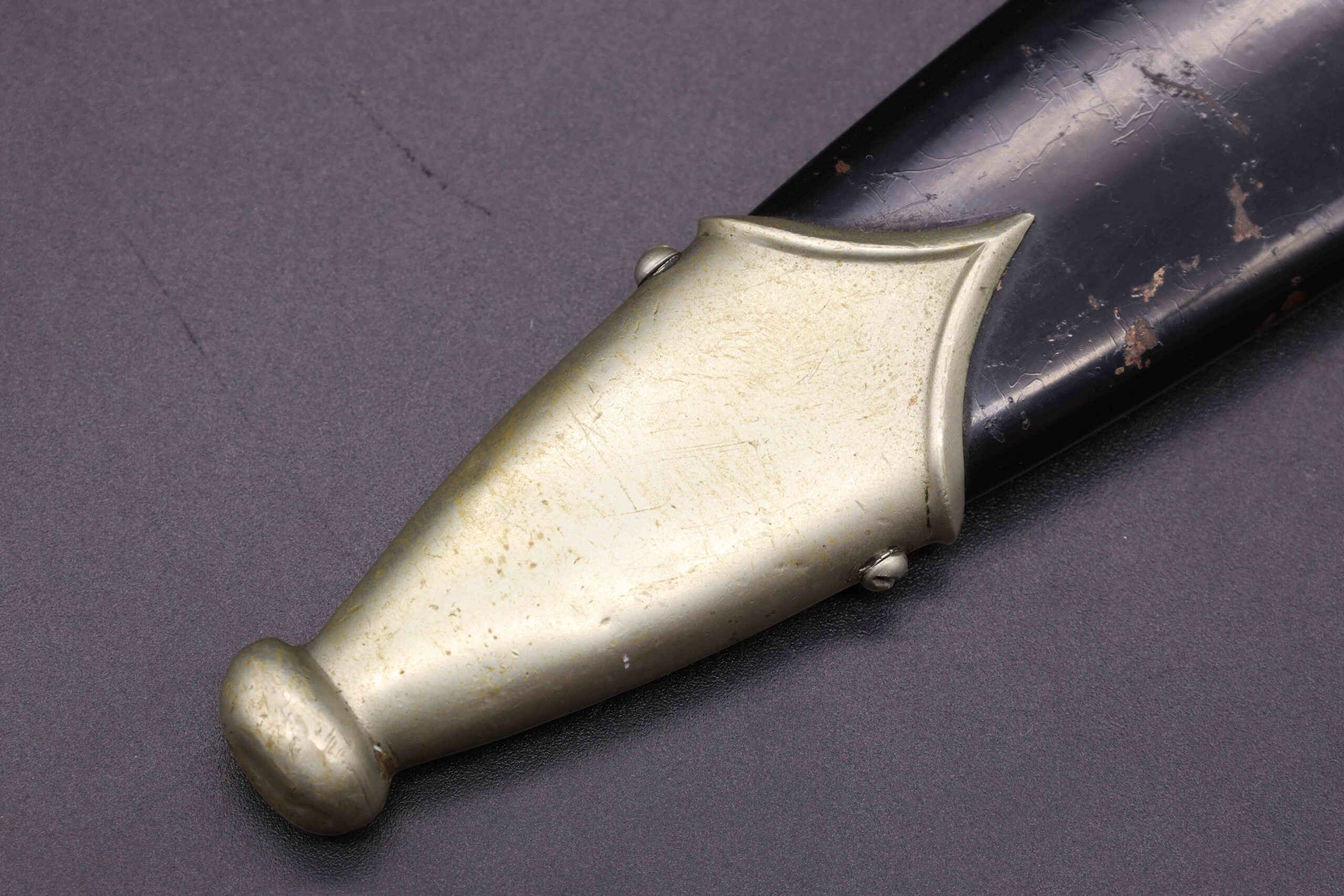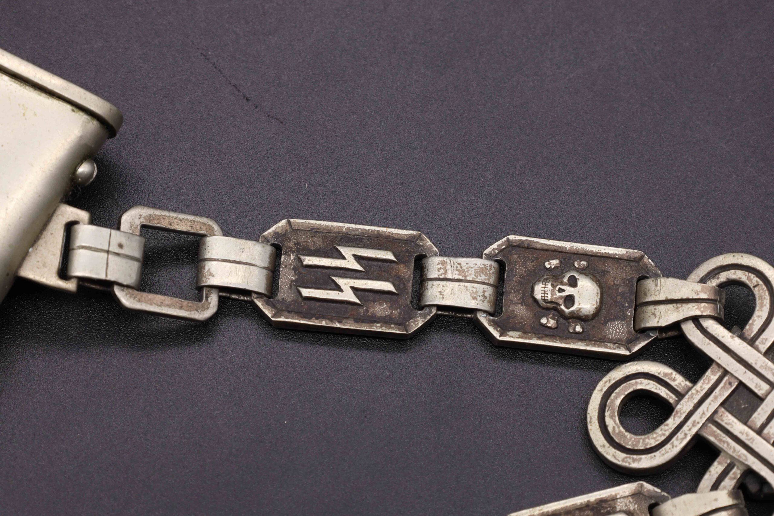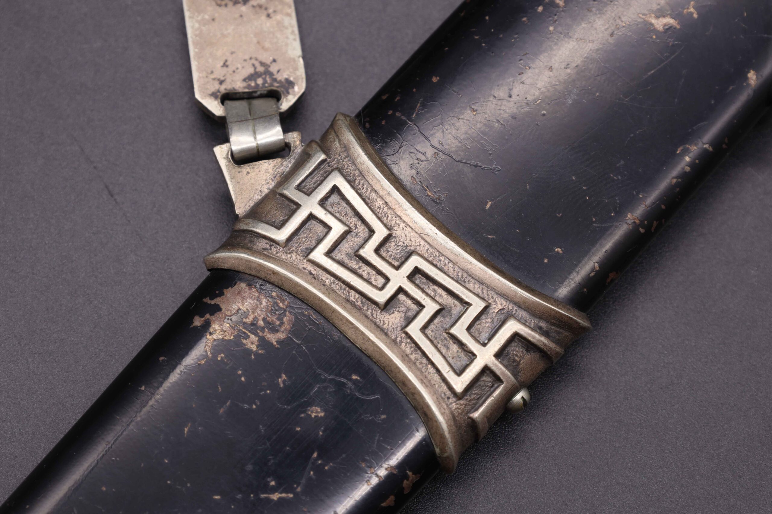 Early production M36 chained SS dagger. The blade is maker marked by Richard Herder. M36 SS daggers have only been produced without a maker’s mark, so this one having a maker’s mark shows that this is a transformed M33 dagger, where the SS member became officer and changed his M33 scabbard for a M36 one. The fitting between the scabbard and the dagger is fantastic, and the patina is also nicely matching. The dagger has nickel silver cross guards, the bottom one stamped with the roman number 2. The black wooden grip has a nickel silver grip eagle and SS roundel, with most of the black enamel still inside. There are two chips in the grip on the top, front and back. The steel blade is in great condition showing cross grain on both sides. The frontside of the blade is etched with the SS motto “Meine Ehre heist Treue”. The backside of the blade is etched with the makers mark “Rich. Abr. Herder Solingen”. I would call the condition of this blade “Mint”. The M36 scabbard has its original black paint and is fitted with nickel silver scabbard fittings and chain. All five screws are in place. The chain is type “B1”, nickel silver with no septum in the skulls. One link is stamped on the backside with the SS stamp. The snap clip is in working order. These early M36 SS daggers are hard to find!