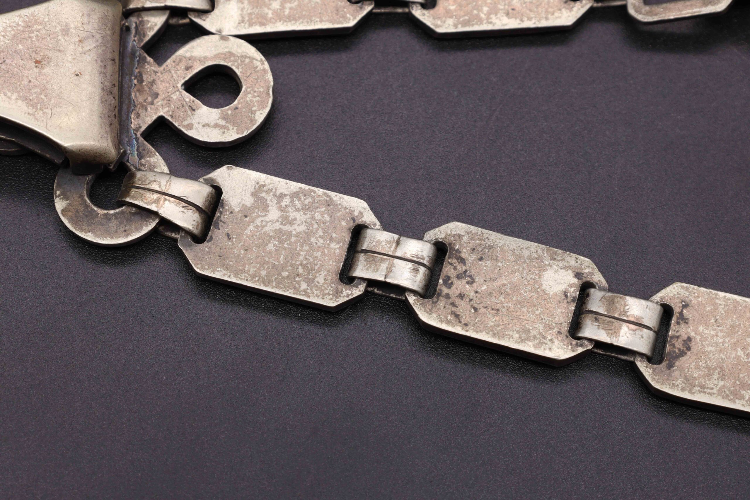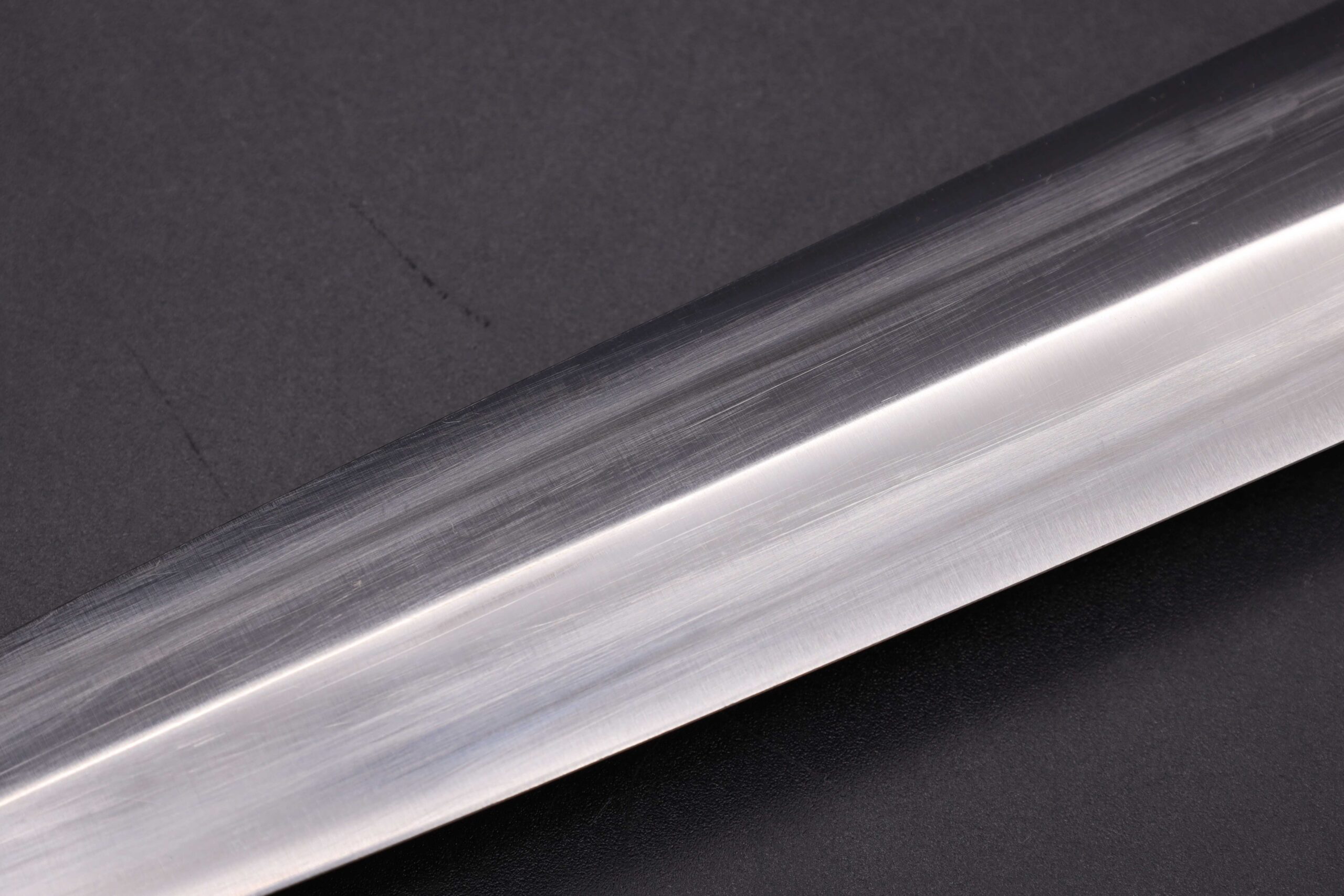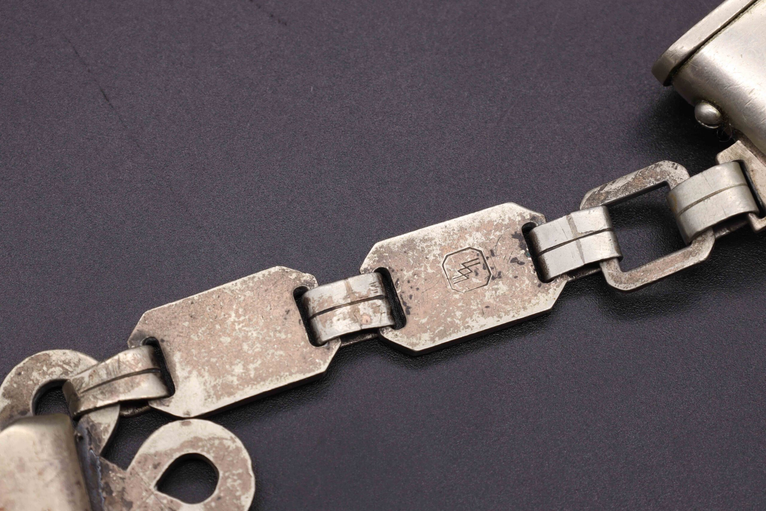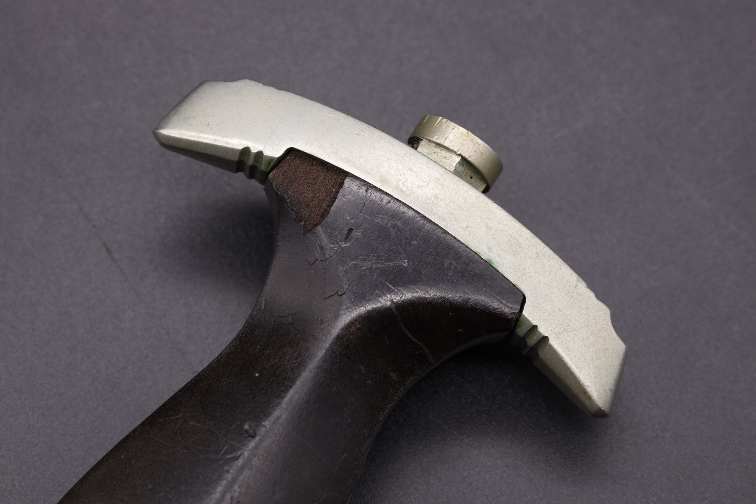 Early production M36 chained SS dagger. The blade is maker marked by Richard Herder. M36 SS daggers have only been produced without a maker’s mark, so this one having a maker’s mark shows that this is a transformed M33 dagger, where the SS member became officer and changed his M33 scabbard for a M36 one. The fitting between the scabbard and the dagger is fantastic, and the patina is also nicely matching. The dagger has nickel silver cross guards, the bottom one stamped with the roman number 2. The black wooden grip has a nickel silver grip eagle and SS roundel, with most of the black enamel still inside. There are two chips in the grip on the top, front and back. The steel blade is in great condition showing cross grain on both sides. The frontside of the blade is etched with the SS motto “Meine Ehre heist Treue”. The backside of the blade is etched with the makers mark “Rich. Abr. Herder Solingen”. I would call the condition of this blade “Mint”. The M36 scabbard has its original black paint and is fitted with nickel silver scabbard fittings and chain. All five screws are in place. The chain is type “B1”, nickel silver with no septum in the skulls. One link is stamped on the backside with the SS stamp. The snap clip is in working order. These early M36 SS daggers are hard to find!