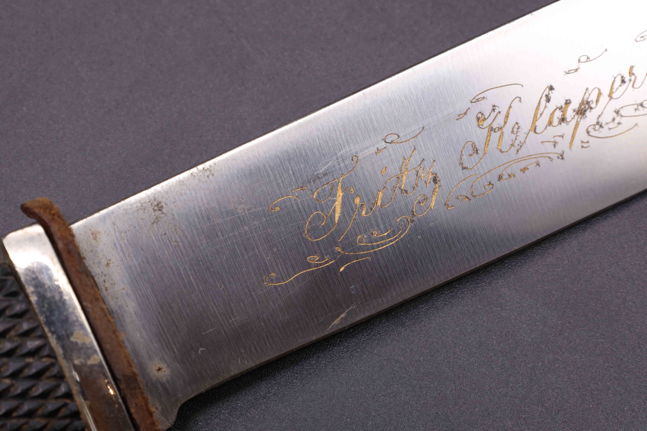 An early production HJ style knife made by Puma Solingen, a private purchase so not for the HJ as there is no HJ grip emblem. Magnetic steel hilt with black Bakelite grip plates held on by nickel silver rivets. Early style steel blade in near mint condition with factory cross grain, engraved on the frontside with the name “Fritz Klaperoth”. The engraving has also been gold gilded. The backside of the blade is stamped with the Puma Solingen makers mark and the “Ges. Geschützt”. The leather buffer pad is in place. The steel scabbard bears the original black paint with visible age hairs. Stiff black leather belt loop and black anodized snap button. Single scabbard runner on the inside, still covered with white cloth. A one of a kind private piece dating from the 3th Reich period.