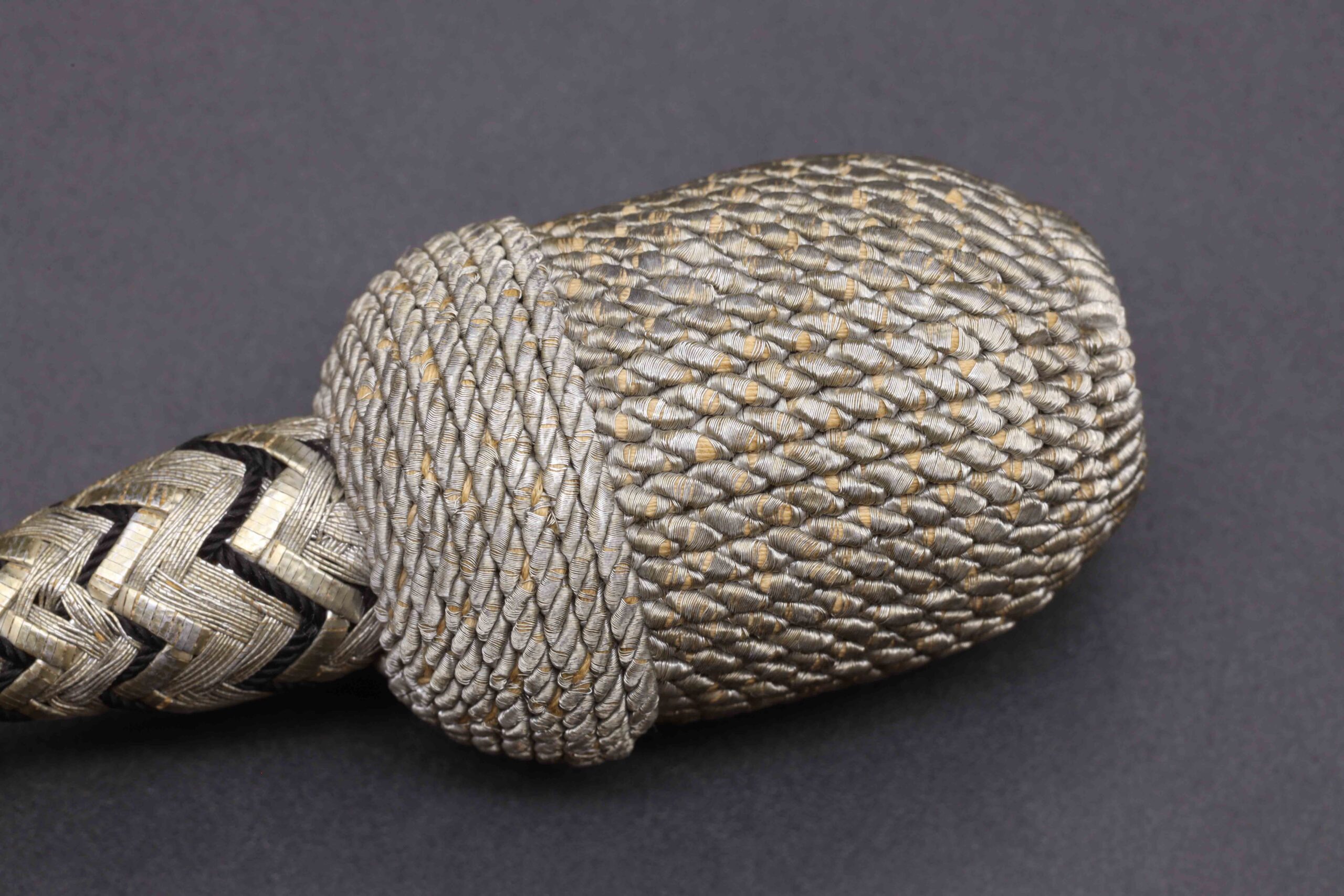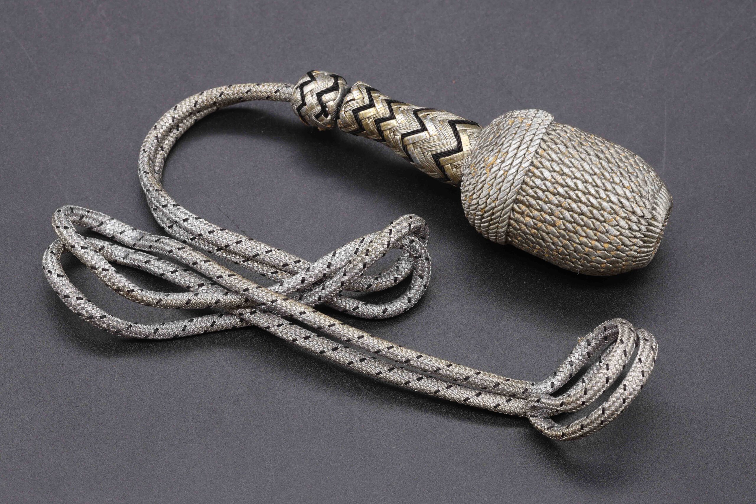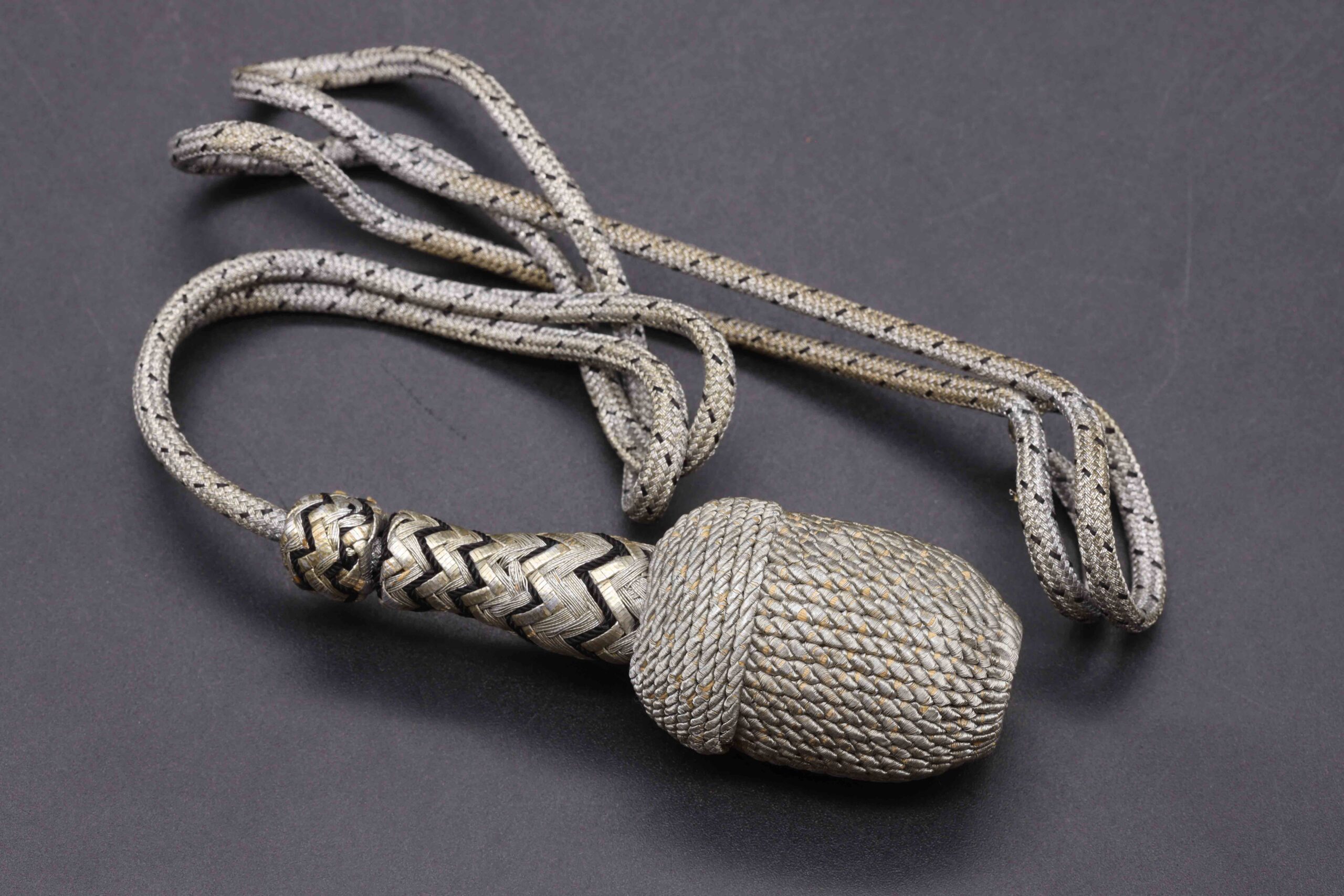 Original German WW2 Railway police (“Bahnschutzpolizei”) dagger portepee. There are more fakes than originals on the market. Watch my video under the photos to see the comparison between a fake and original railway portepee. This portepee is in overall great condition, with light signs of wear. The bottom has the black spiral wire. Fine silver rope with black spots. A hard to find portepee!