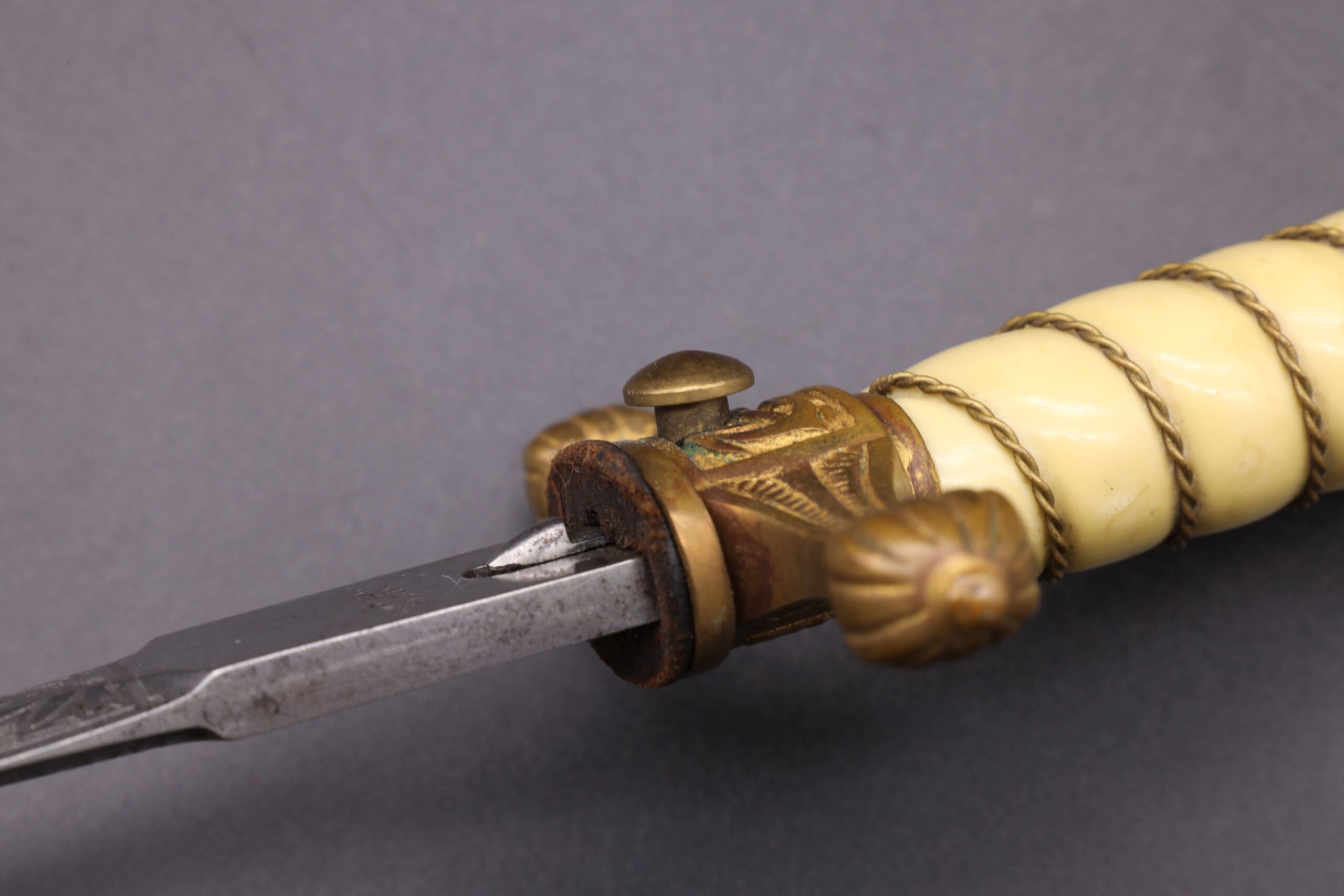 German WW2 Kriegsmarine dagger made by Clemen & Jung. White plastic covered wooden grip with intact wire wrapping. Brass eagle pommel screw and cross guard with working pushbutton. Note the position of the push button inside the cross guard and not on the bottom, like with the Puma Navy daggers. Steel blade etched on both sides with naval motifs, stamped on the frontside with the Clemen & Jung shield logo “Z” and on the backside with “Clemen & Jung Solingen”. There is corrosion visible on the blade. A leather buffer pad is in place. The “lightning” scabbard has a couple of dents and both scabbard screws in place.