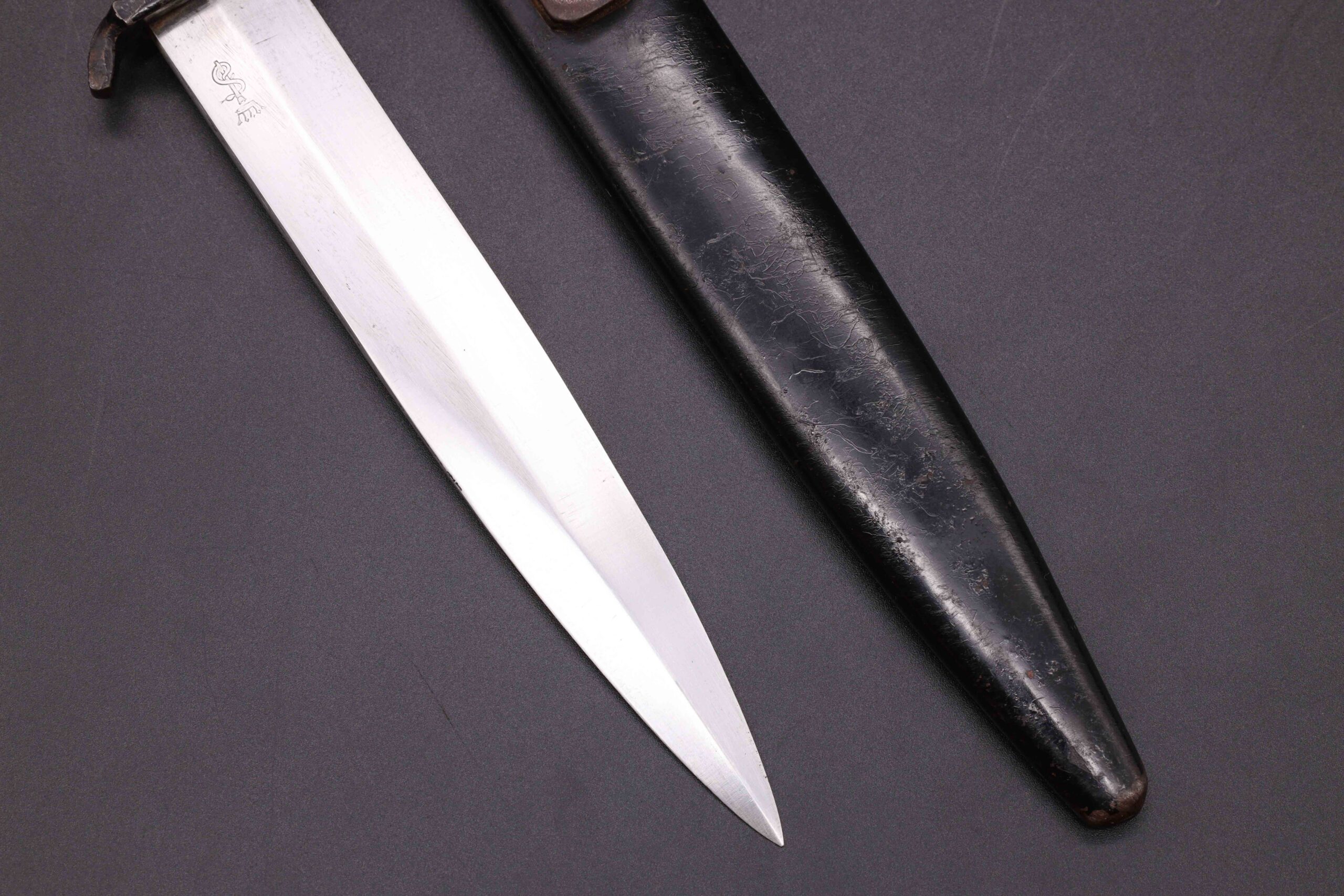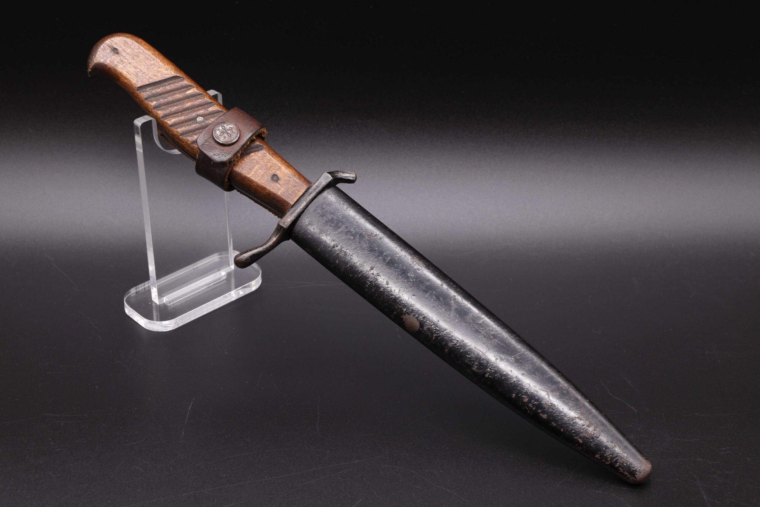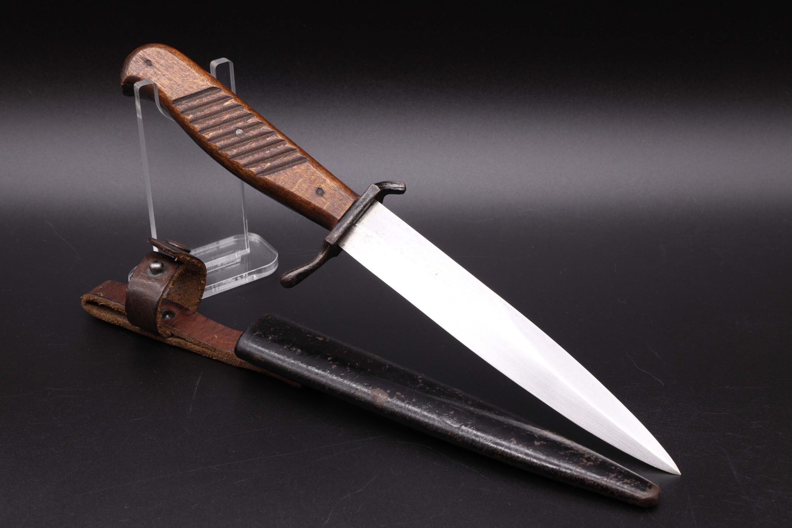 Beautiful WW1 combat knife in good condition. Wooden grip plates held on by three steel rivets. Black-painted steel cross guard with one hook. Clean steel blade showing cleaning marks. The back of the blade is stamped with the Aesculap makers mark. The original black-painted scabbard has a good-condition stiff leather belt loop with a working “star” snap button.