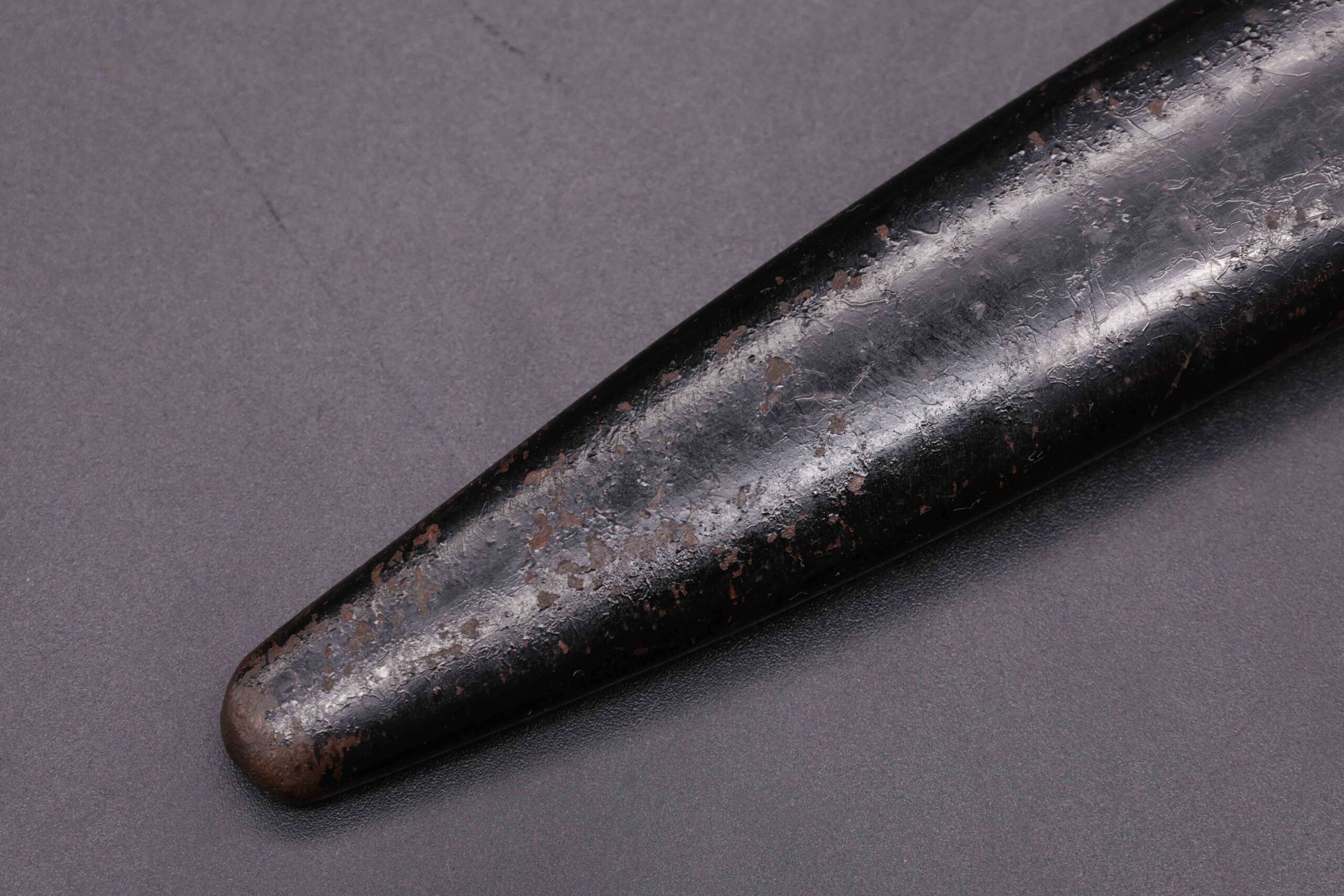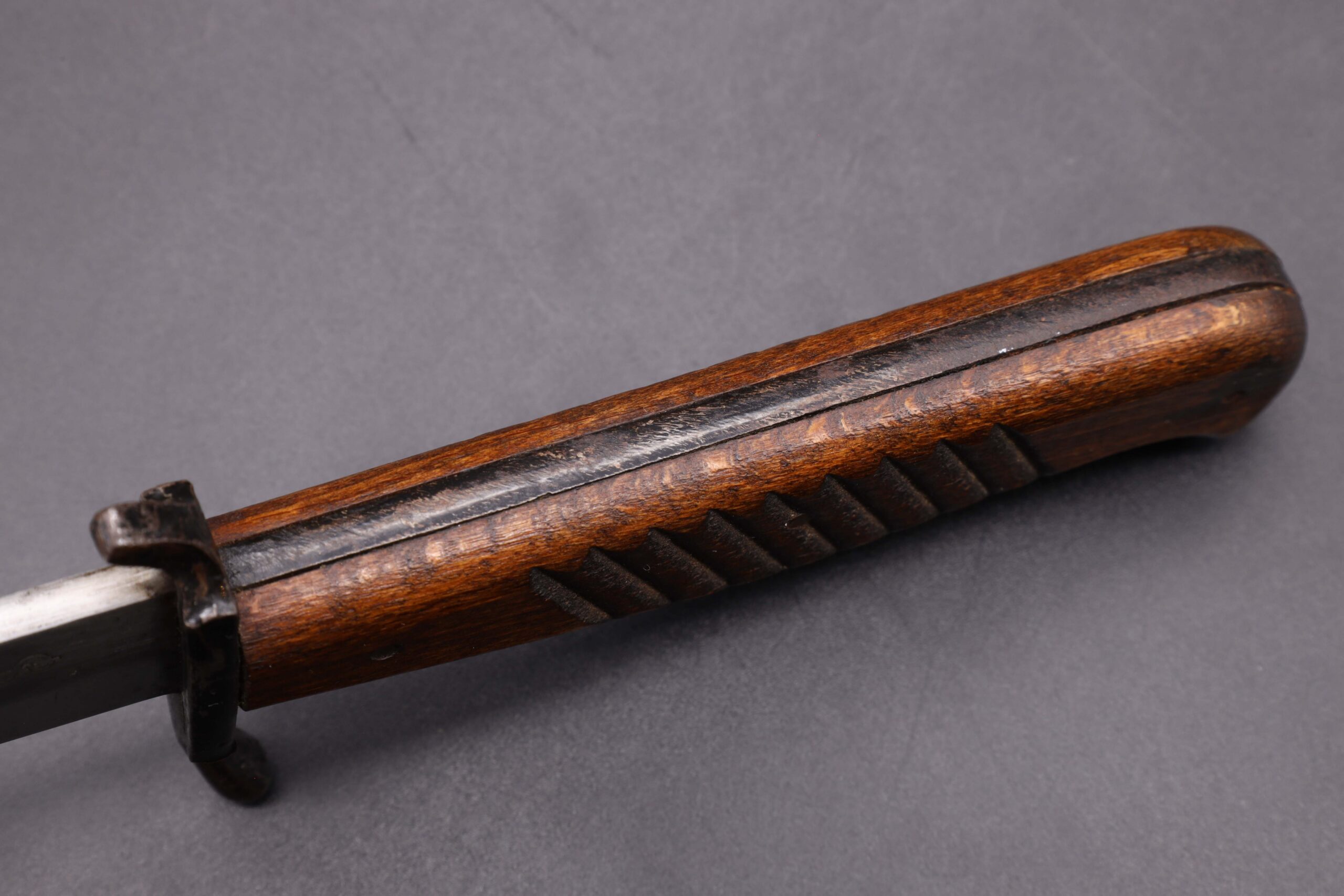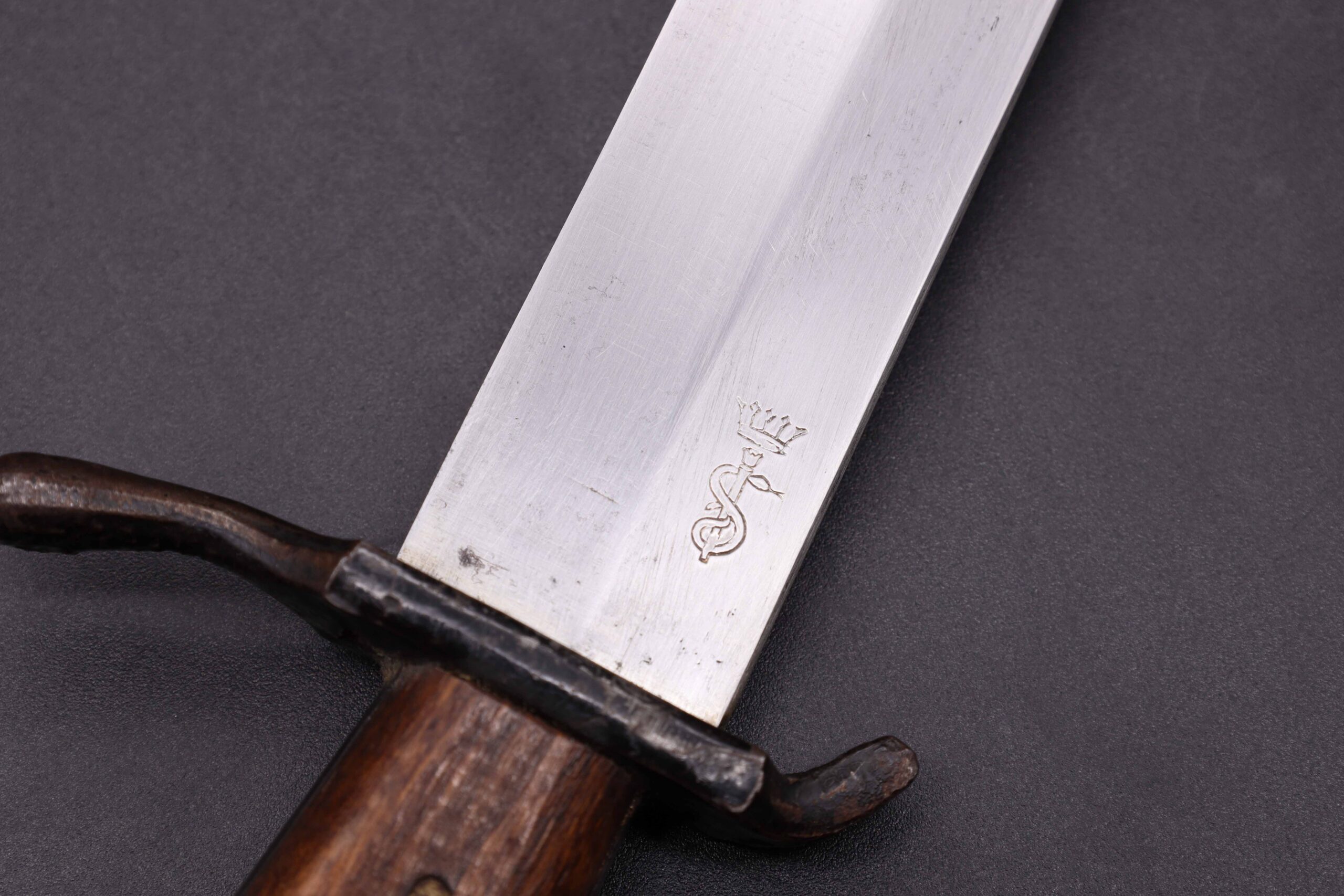 Beautiful WW1 combat knife in good condition. Wooden grip plates held on by three steel rivets. Black-painted steel cross guard with one hook. Clean steel blade showing cleaning marks. The back of the blade is stamped with the Aesculap makers mark. The original black-painted scabbard has a good-condition stiff leather belt loop with a working “star” snap button.
