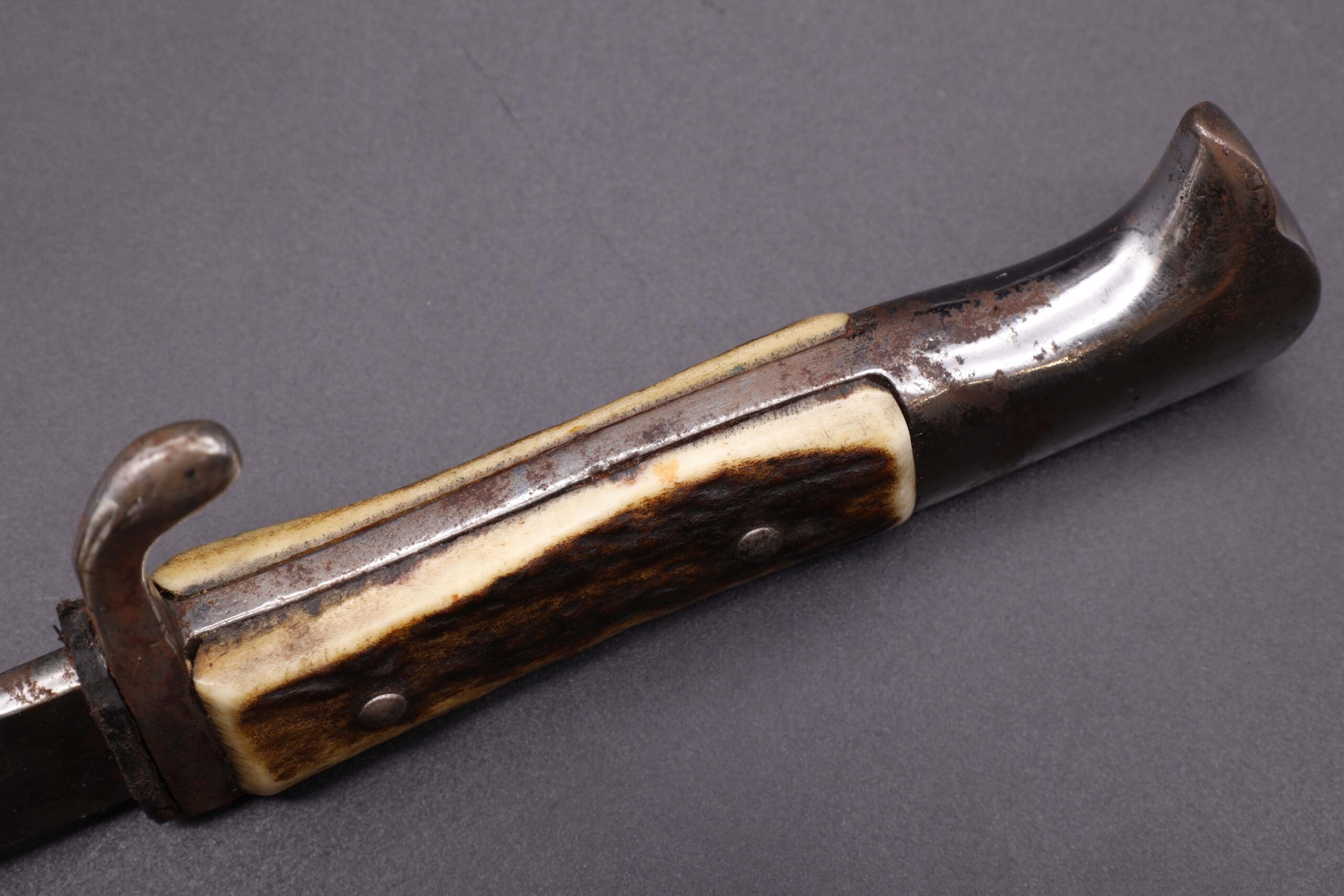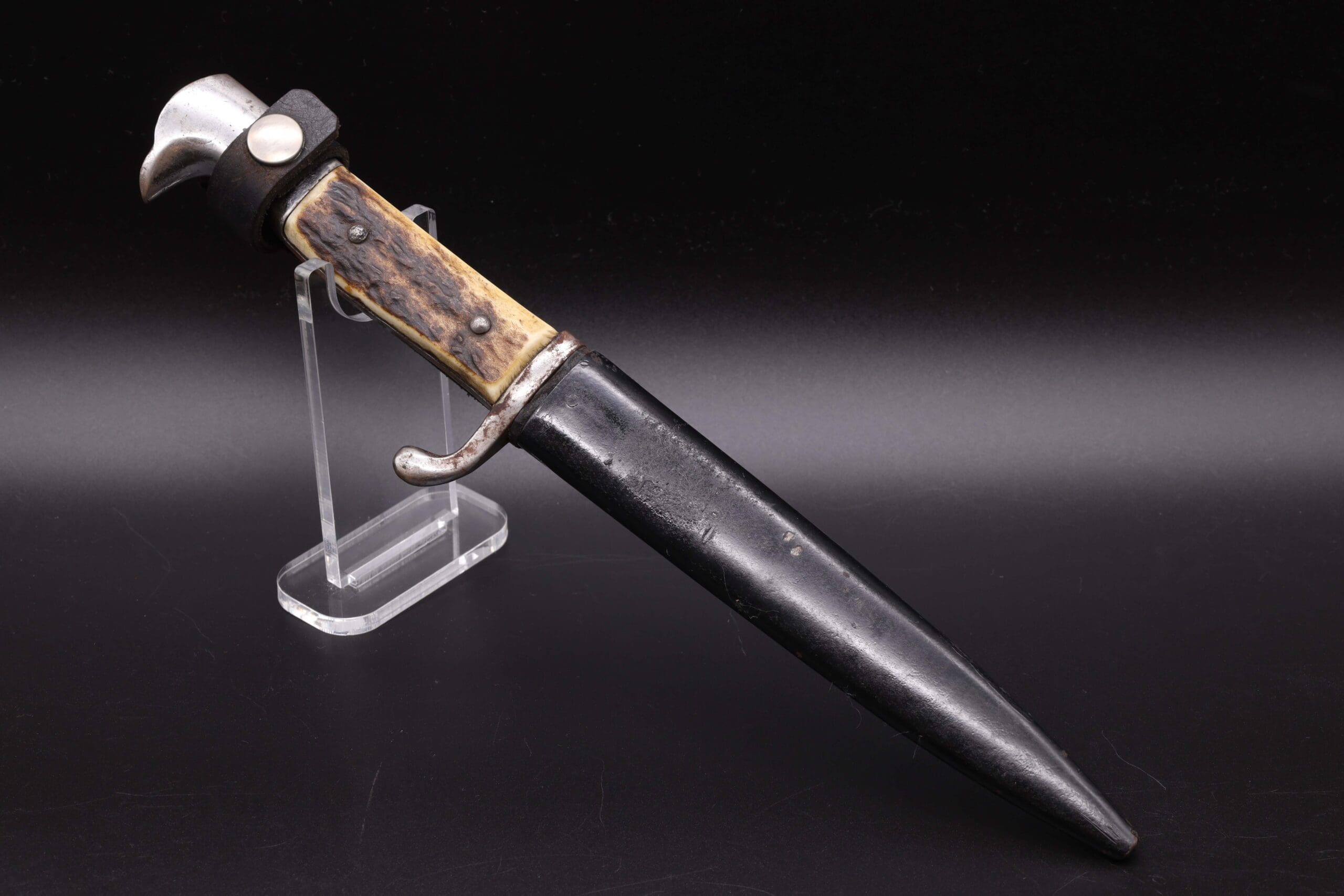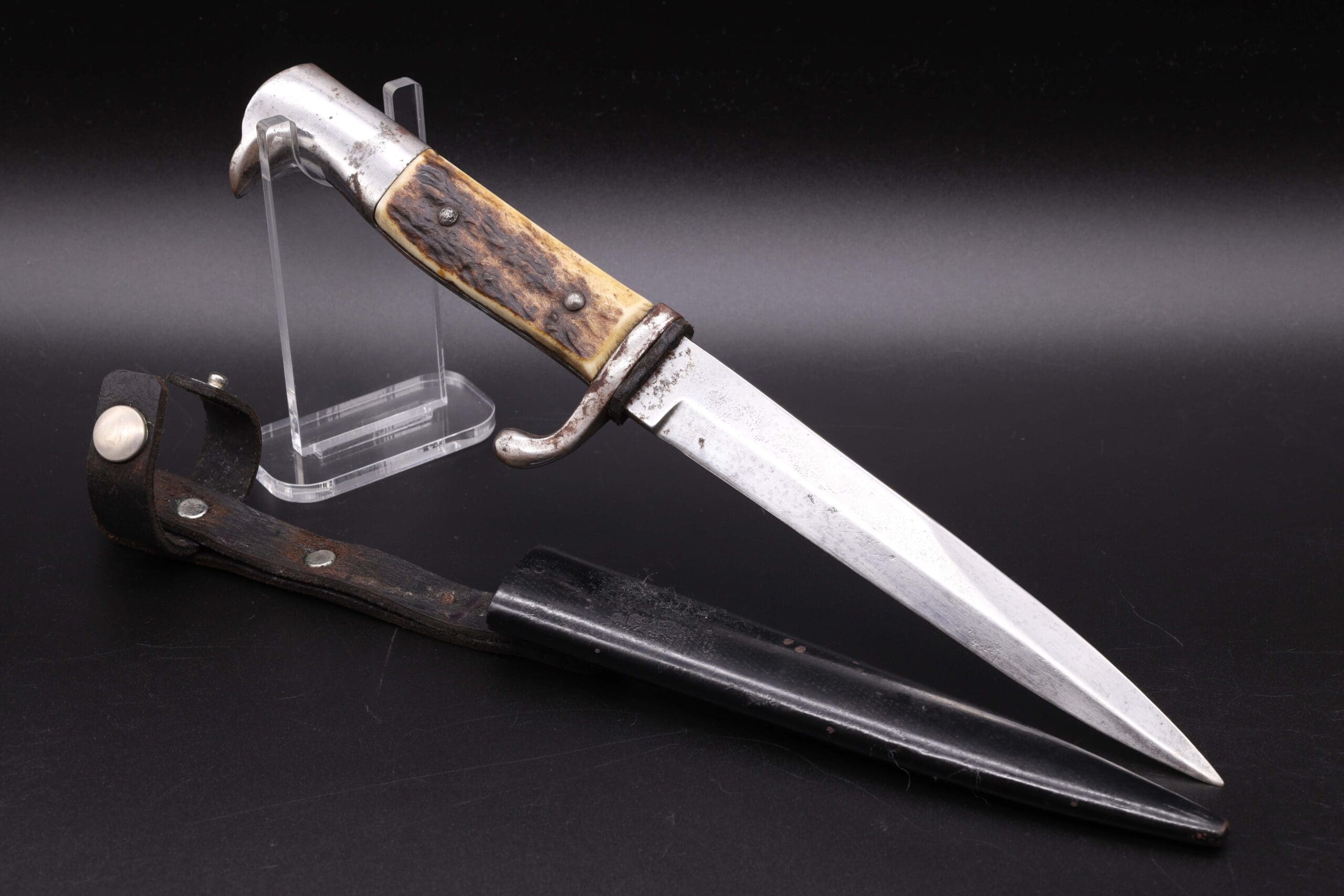 German WW1 combat knife with a stag horn grip. Steel magnetic hilt with corrosion marks. Stag horn grip plates held on by two steel rivets. Steel blade with signs of corrosion and cleaning. No makers mark. The leather buffer pad is in place. Repainted steel scabbard with replaced leather belt loop and working snap button.
